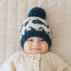Knit with waves and Whales swimming around, this fun hat is knit in Natural hued yarn with shades of blue. The whales even have little spouts of water! You'll love how soft and cozy this hat is. Our hats are partially knit from recycled, sustainable Polyester yarn made from plastic bottles. We are on a mission to help reduce the world's plastic pollution problem