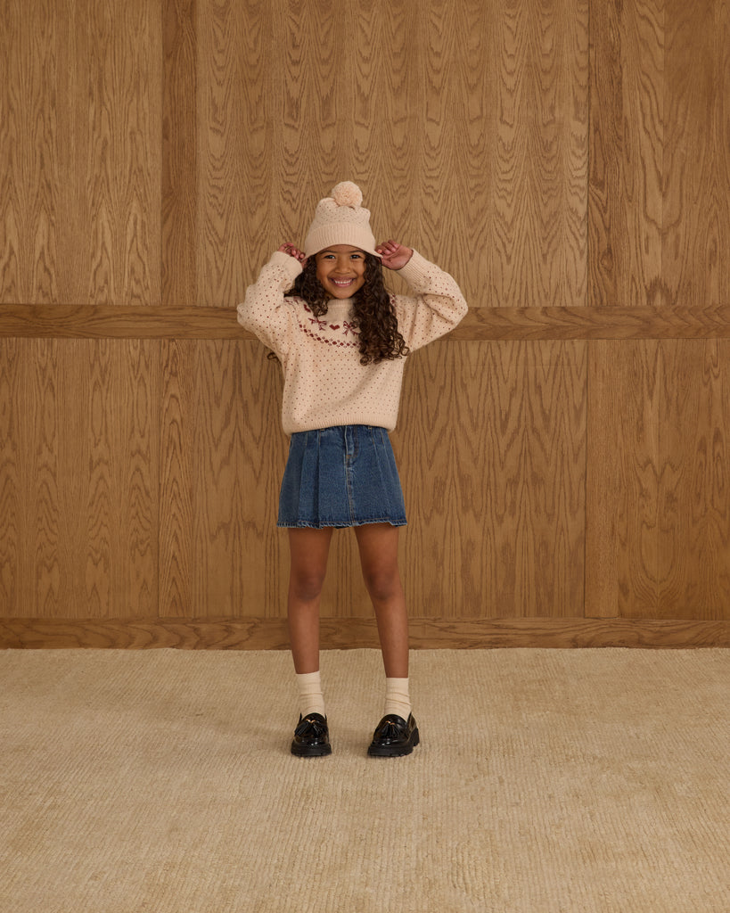 This Fair Isle Sweater is a cozy knit featuring a sweet bow motif and traditional fair isle patterning. Designed in a soft petal base with warm accents, it brings both comfort and charm to everyday wear.
