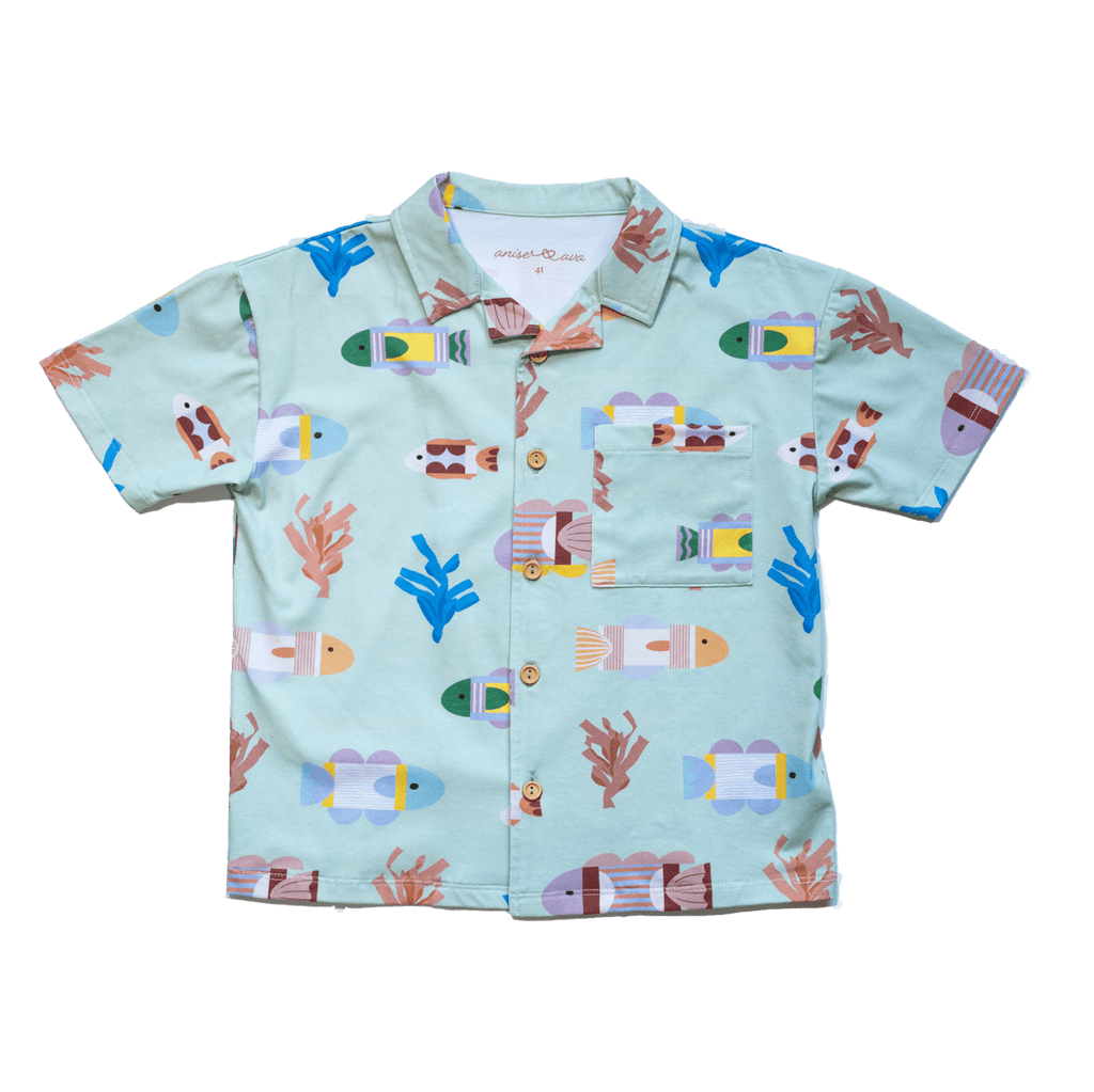 Our new short sleeves pocketed button down shirt in colorful exclusive hand drawn print. Worn open or closed for different occasion. Made to match siblings styles. Details: * Short Sleeves. * Point collar with wooden buttons for closure. * Premium cotton with extra stretch. * Pocket for little treasures. * Eco friendly printed. * 95% Premium Cotton 5% Elastane