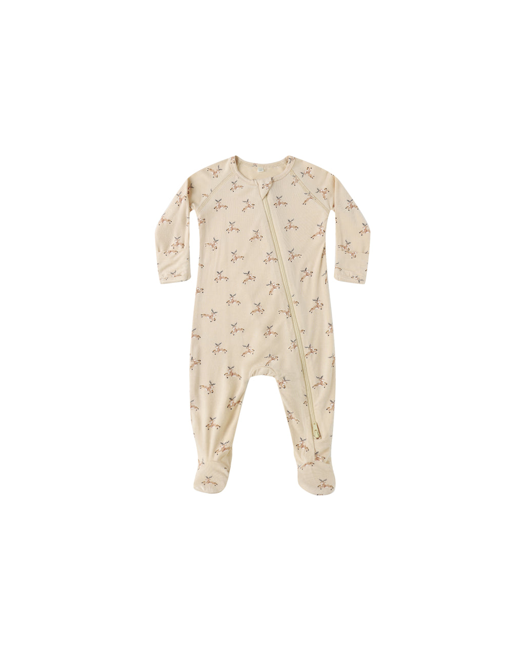 Full double-zip footie crafted from our soft and stretchy bamboo fabric. Fold-over hand mitts included on sizes NB – 3-6M. Raised screen print on soles of size 6-12M for added traction. Featuring our ‘reindeer’ print on our 'antique' hue.