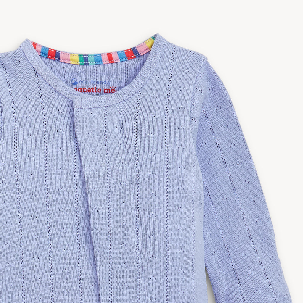 Our organic cotton pointelle Magnetic Footie, also known as a sleeper, is made with magnetic closures that are quick, quiet, and a lifesaver for middle-of-the-night changes. Naturally soft + breathable for year-round wear, it's the perfect layette present made of organic cotton + delicate pointelle stitching.