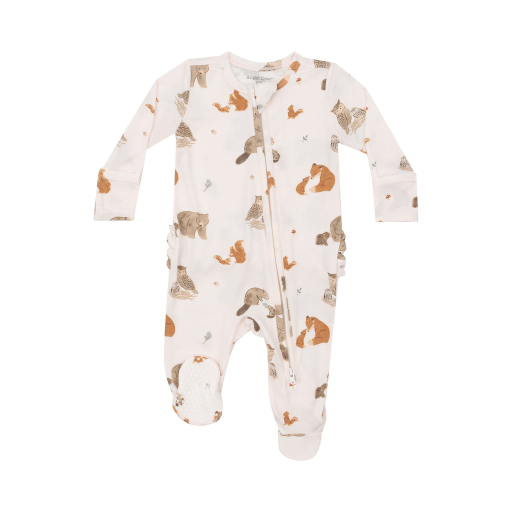Two Way Zipper Ruffle Back Footie (Mixed Woodland Animals Pink)