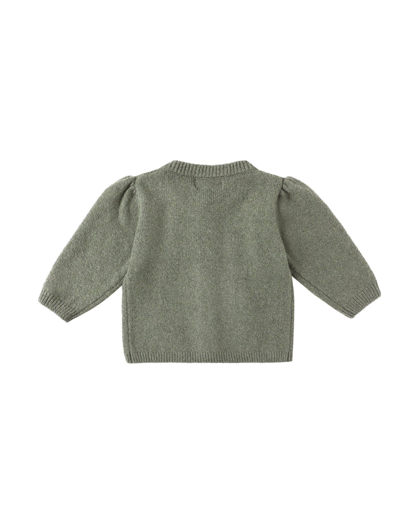 This darling cardigan showcases a beautiful cross cable knit design and buttons down the front for an extra sweet look. Featuring our ‘forest’ hue.