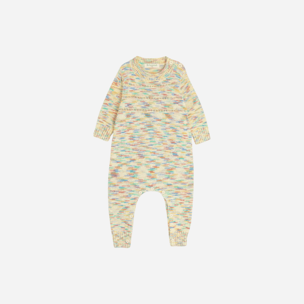 Introducing Our iconic Bonniemob space-dye knitted baby playsuit! A timeless piece to love and cherish season after season. Crafted from 100% Organic cotton, this beautifully soft knitted onesie is made with a unique rainbow space-dyed yarn, developed exclusively by our founder Tracey, making it truly, one-of-a-kind!