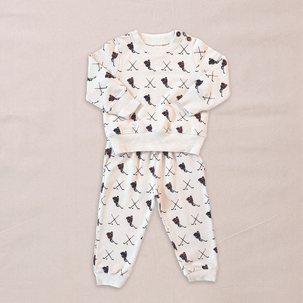 Adventure time! Whether road-tripping, charming the fam or just cruising around the living room, our Baby Jax Jogger Set keeps little explorers cozy and ready to roll. Reimagined for the cooler months in our super luxe French Terry, the long-sleeve sweatshirt features ribbed cuffs and hem, plus an easy button closure at the neck for quick changes. The comfy jogger bottoms have side pockets (for tiny treasures!) and ribbed ankle cuffs for the perfect fit. Finished with our signature Coop logo patch at the back—because every outing needs a flash of style! You'll find our Baby Jax Jogger Set in an array of solids and vintage-inspired prints.