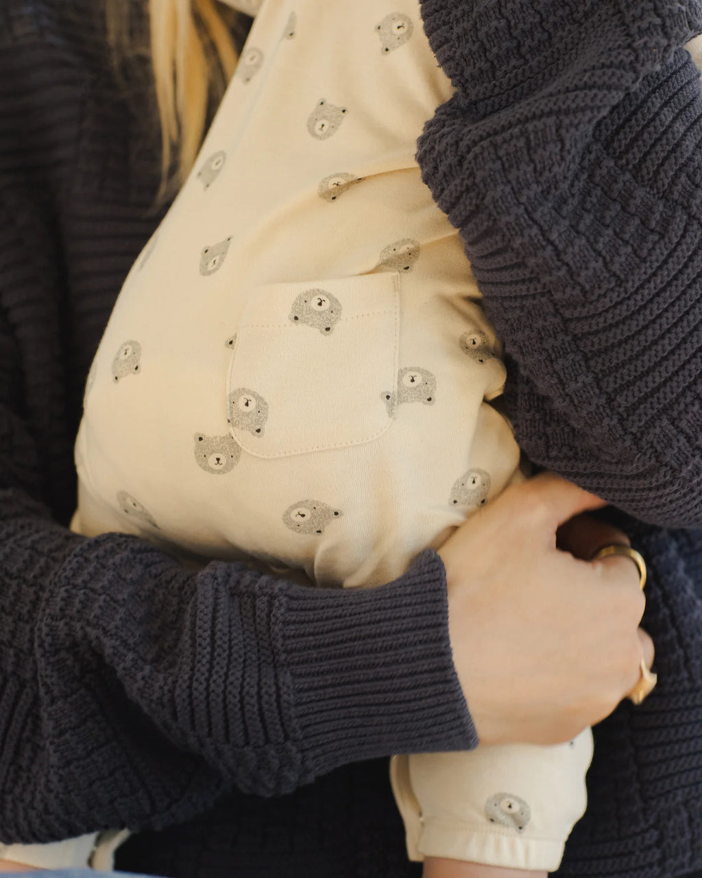 This long sleeve jumpsuit is an easy go-to, featuring coconut buttons down the front and a small back pocket for a simple finish. Hidden snaps along the inseam on sizes 0-3M - 18-24M make for easy changes.