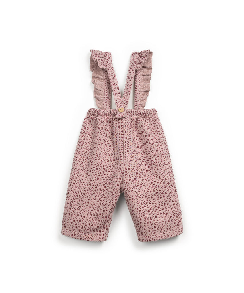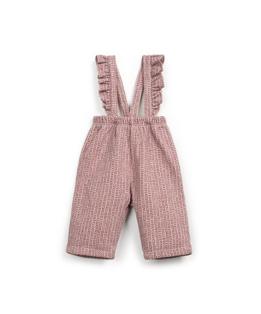This jumpsuit is made of fleece with a blend of organic cotton and cotton, in Light Pink color. It is a model with straps, has a back opening with coconut button and spine print.