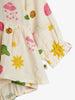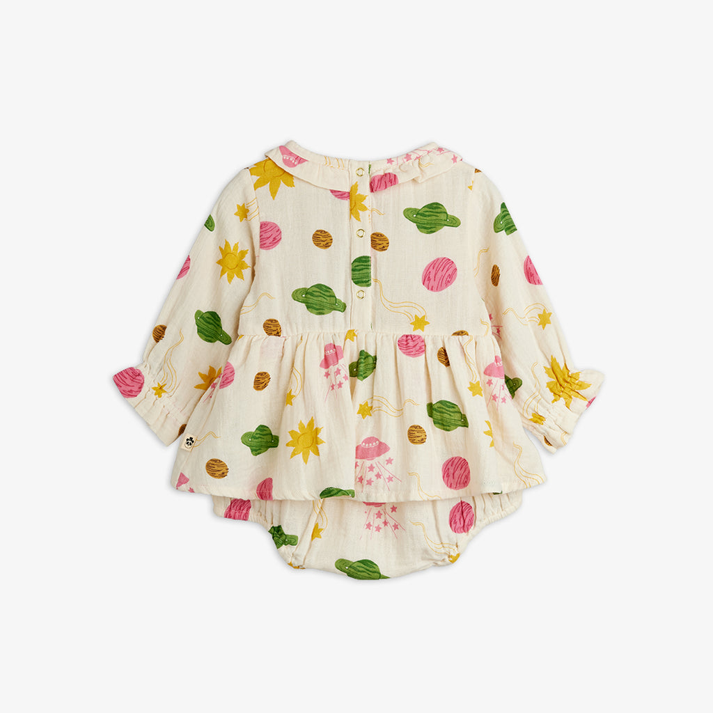 Bodysuit made from 100% organic cotton muslin. Features long sleeves, a ruffled collar and a flounced peplum layer in the Space print. Snap closure at crotch and elasticated leg openings for easy dressing and comfort. Lightweight and breathable for warm days.