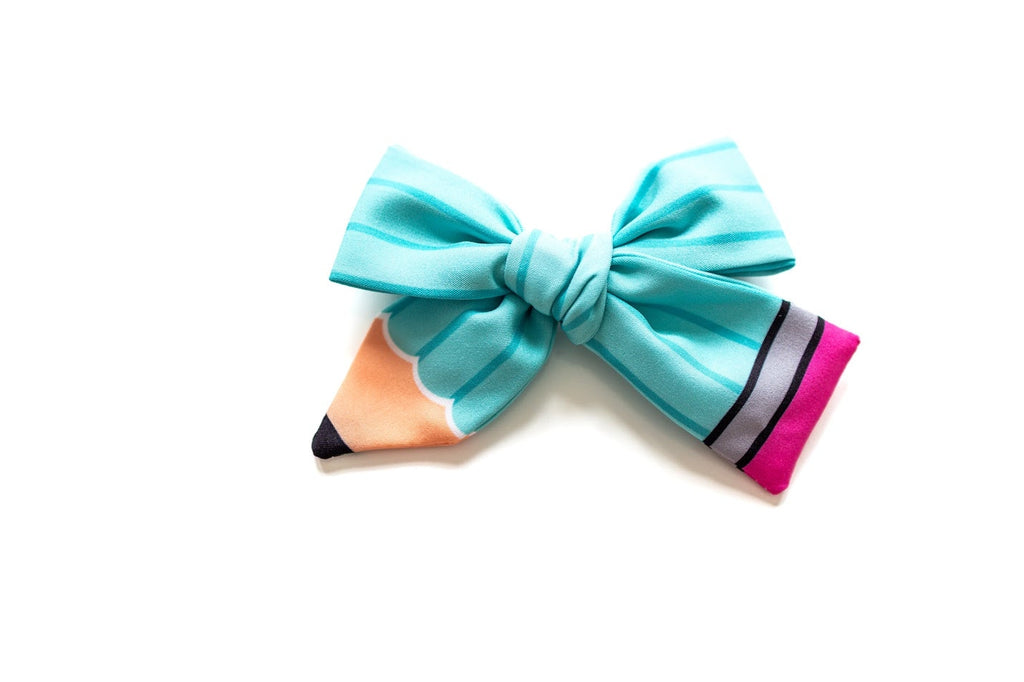 Twist up your tresses with our Teal Lead The Look Hair Bow! This pencil-shaped accessory adds a splash of scholarly style to any 'do. Perfect for first-day photos, classroom adventures, or showing off your school spirit. Make homework time a little more fun with this playful, eye-catching accessory! -Approximately 4.5" X 6" for large and 3.5" X 5" for small -Alligator clip