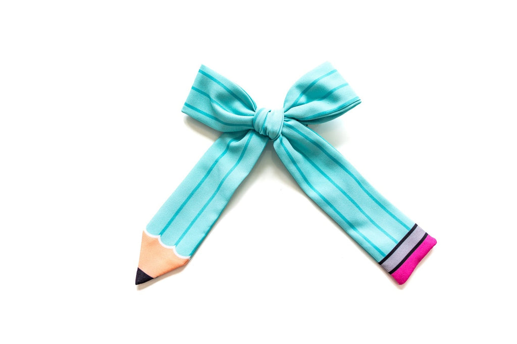 Twist up your tresses with our Teal Lead The Look Hair Bow! This pencil-shaped accessory adds a splash of scholarly style to any 'do. Perfect for first-day photos, classroom adventures, or showing off your school spirit. Make homework time a little more fun with this playful, eye-catching accessory! -Approximately 4.5" X 6" for large and 3.5" X 5" for small -Alligator clip