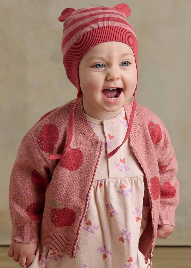 Wrap your little one in cozy charm with the Aymer Apple Knit Cardigan in Rosy. Soft, breathable knit fabric keeps them comfy while playful apple details add a sweet touch to any outfit. Perfect for layering during chilly days, this cardigan combines warmth and whimsy for everyday adventures.
