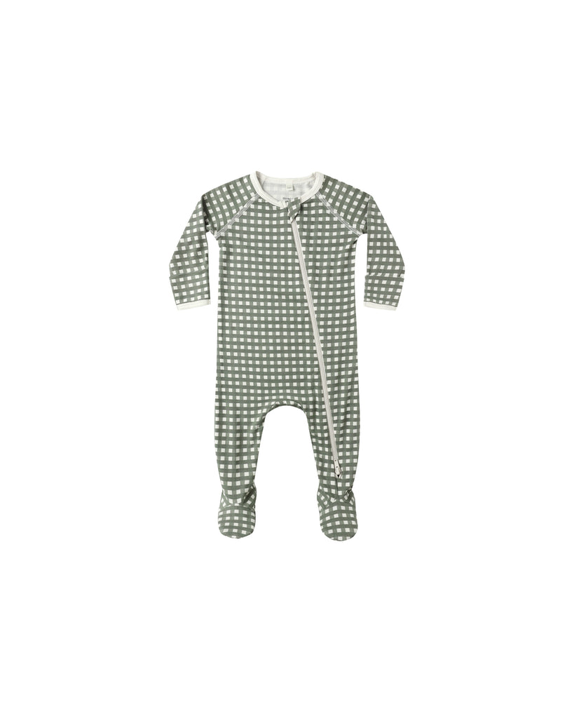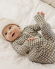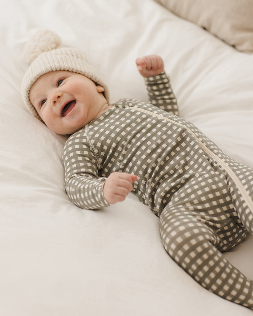 Full double-zip footie crafted from our soft and stretchy bamboo fabric. Fold-over hand mitts included on sizes NB – 3-6M. Raised screen print on soles of size 6-12M for added traction. Featuring our ‘forest check’ print on our 'ivory' hue.
