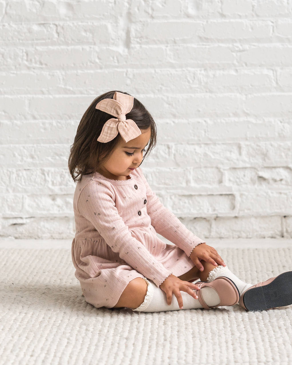 The Bryn Brushed Pointelle Henley Dress is full of charm and softness, perfect for everyday adventures and special moments alike. Made from cozy organic brushed pointelle, this dress features a sweet picot edge along the neckline and sleeves, plus a wooden button henley placket for a timeless touch. The gathered waist seam adds gentle volume for twirls. Dress it up or down, it’s a go-to piece for every season.