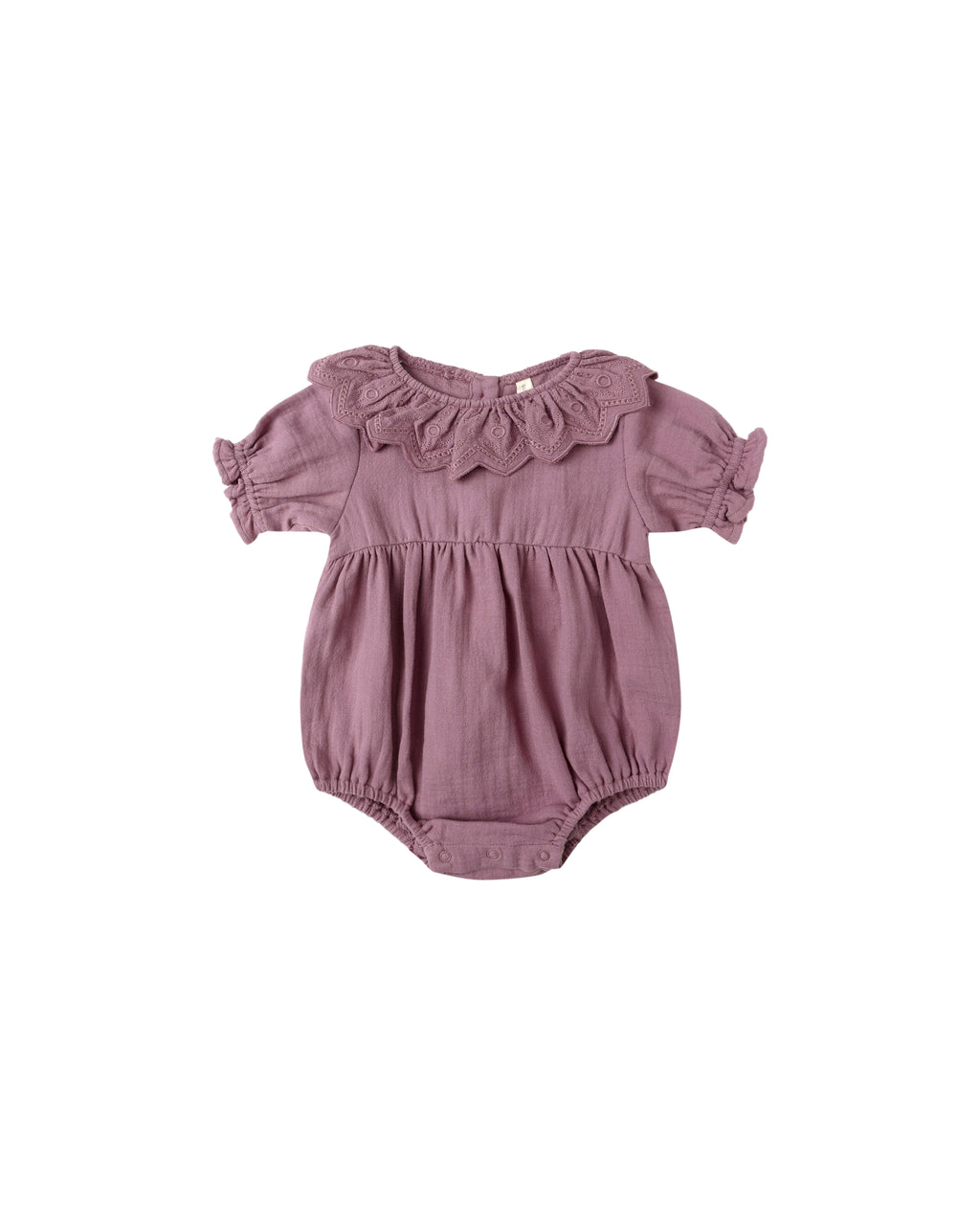 A sweet romper with a collar, short puff sleeves, and ruffle details, finished with back buttons and bottom snaps for easy changing.