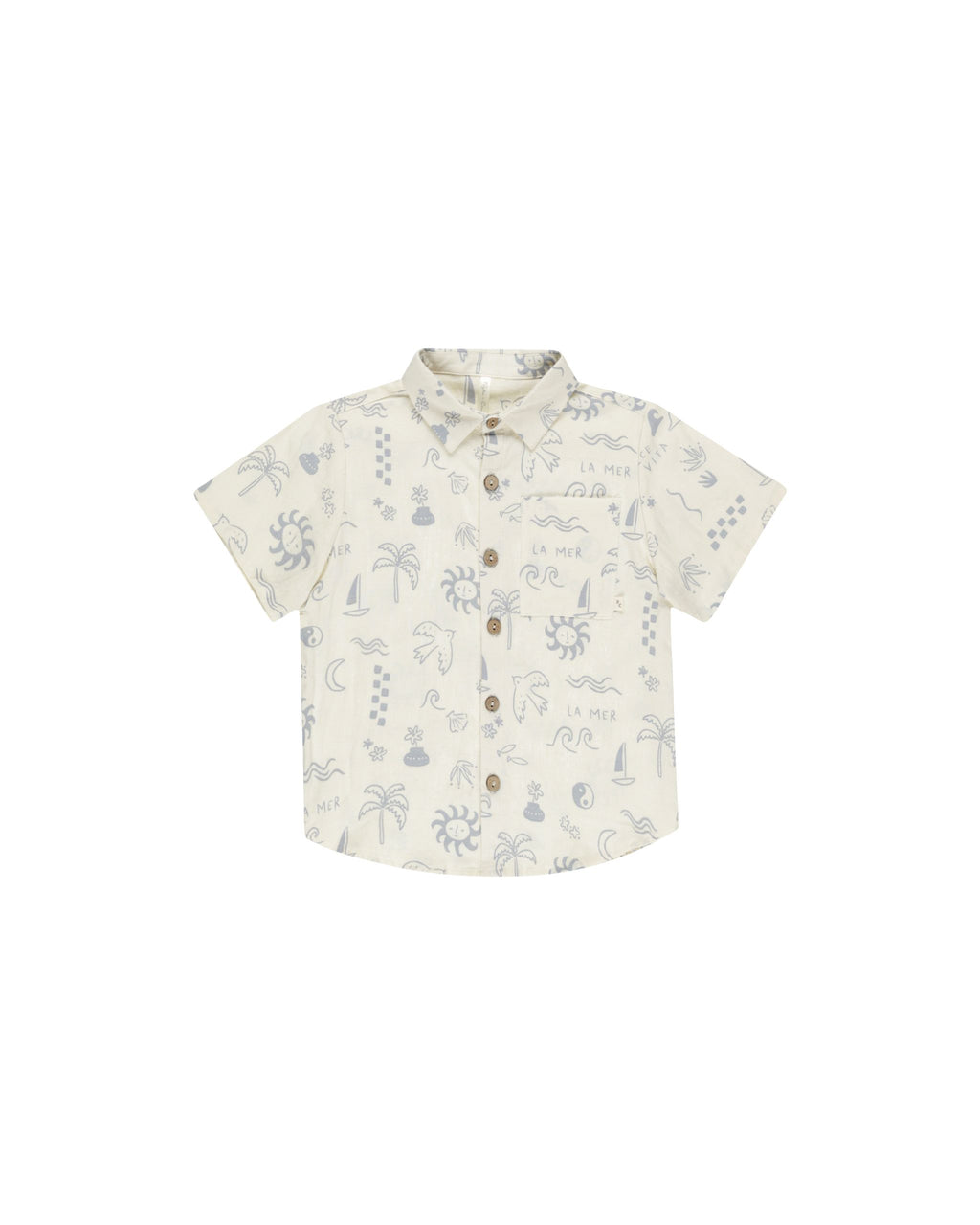 A classic collared boys short sleeve button-down shirt with coconut buttons.