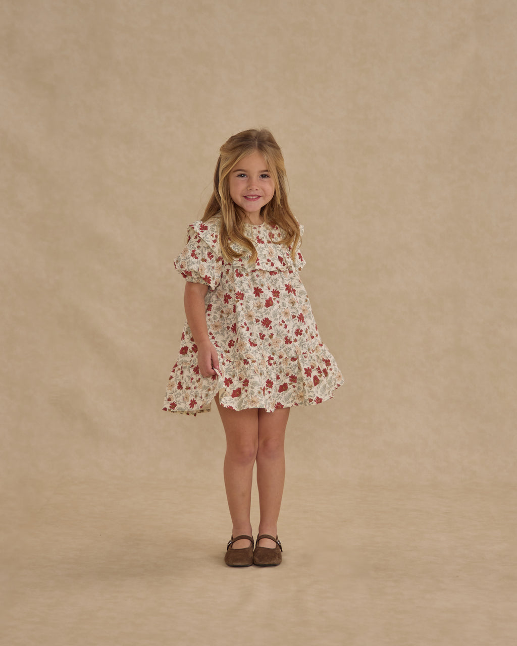 Our Cordelia Dress features elasticized sleeve openings and a ruffle along the neck and bottom skirt.