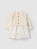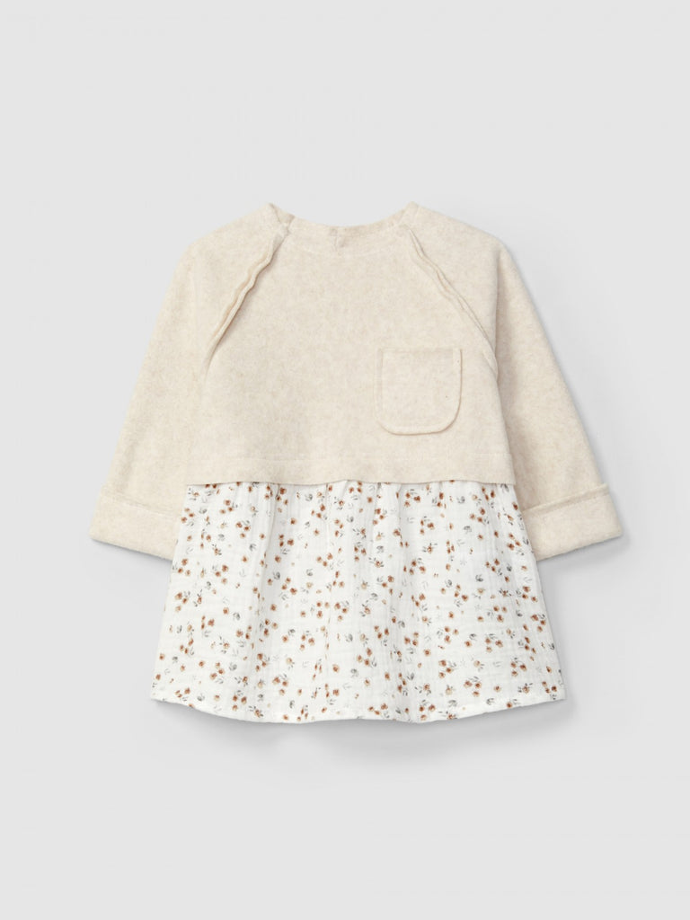 Dress with top part in soft and warm 100% organic cotton fleece with outer stitching effect. Functional pocket on the front, sleeves can be used rolled up or rolled down for greater durability. Bottom part in 100% muslin with floral print. Fastens with wooden buttons at the back.