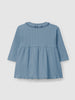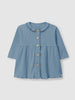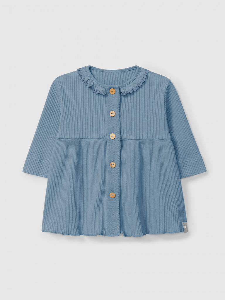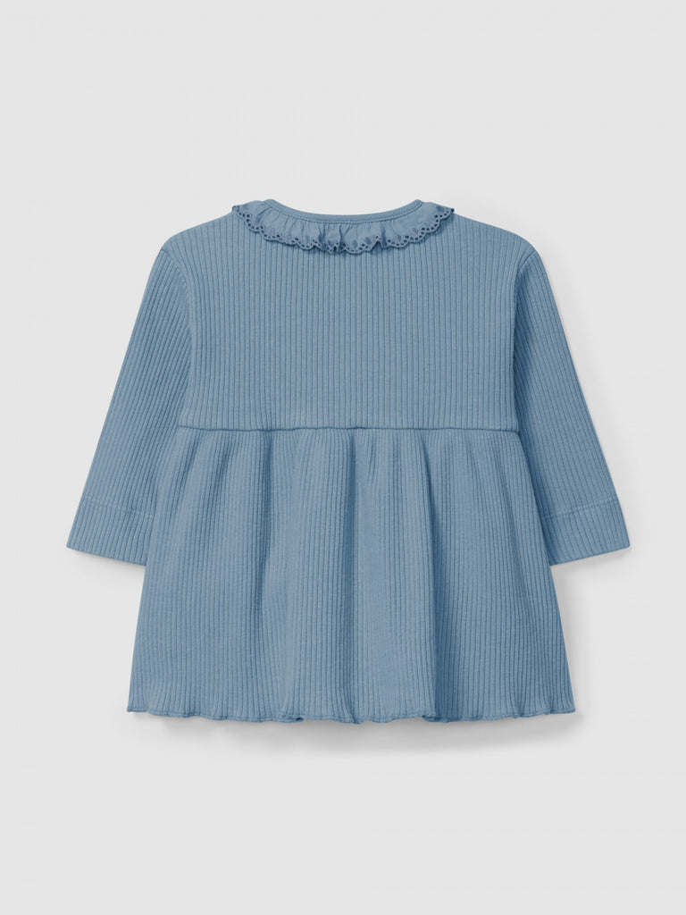 Dress in ribbed organic and recycled cotton jersey with ruffled embroidered collar. Fastens with full-length wooden buttons on the front.