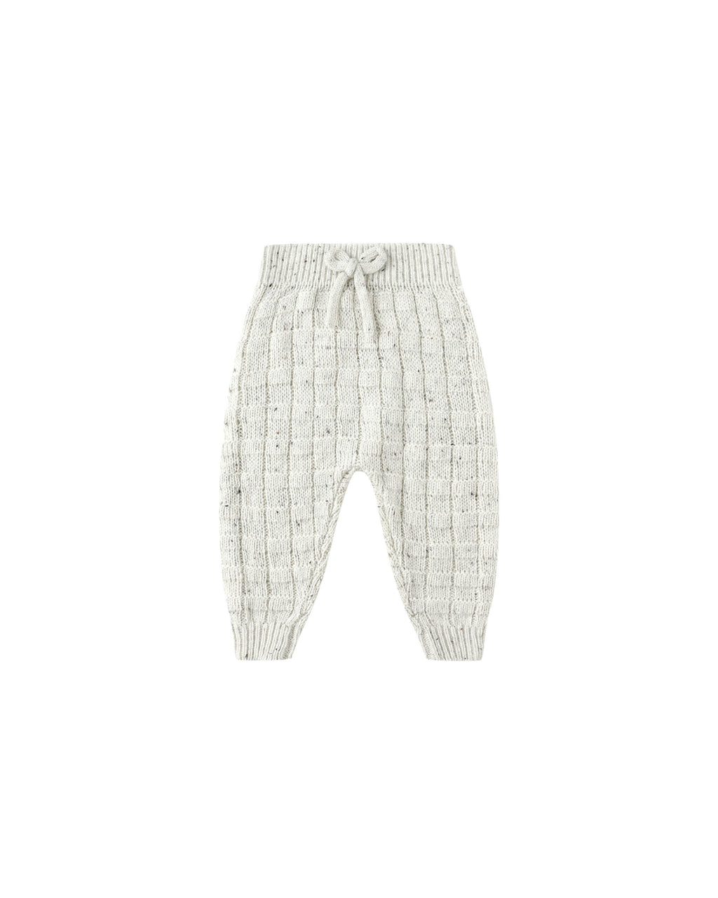 Our Gable Pants, crafted in cozy checker sweater knit, feature ribbed trim at the waistband and leg openings, with a charming faux tie detail at the center front.