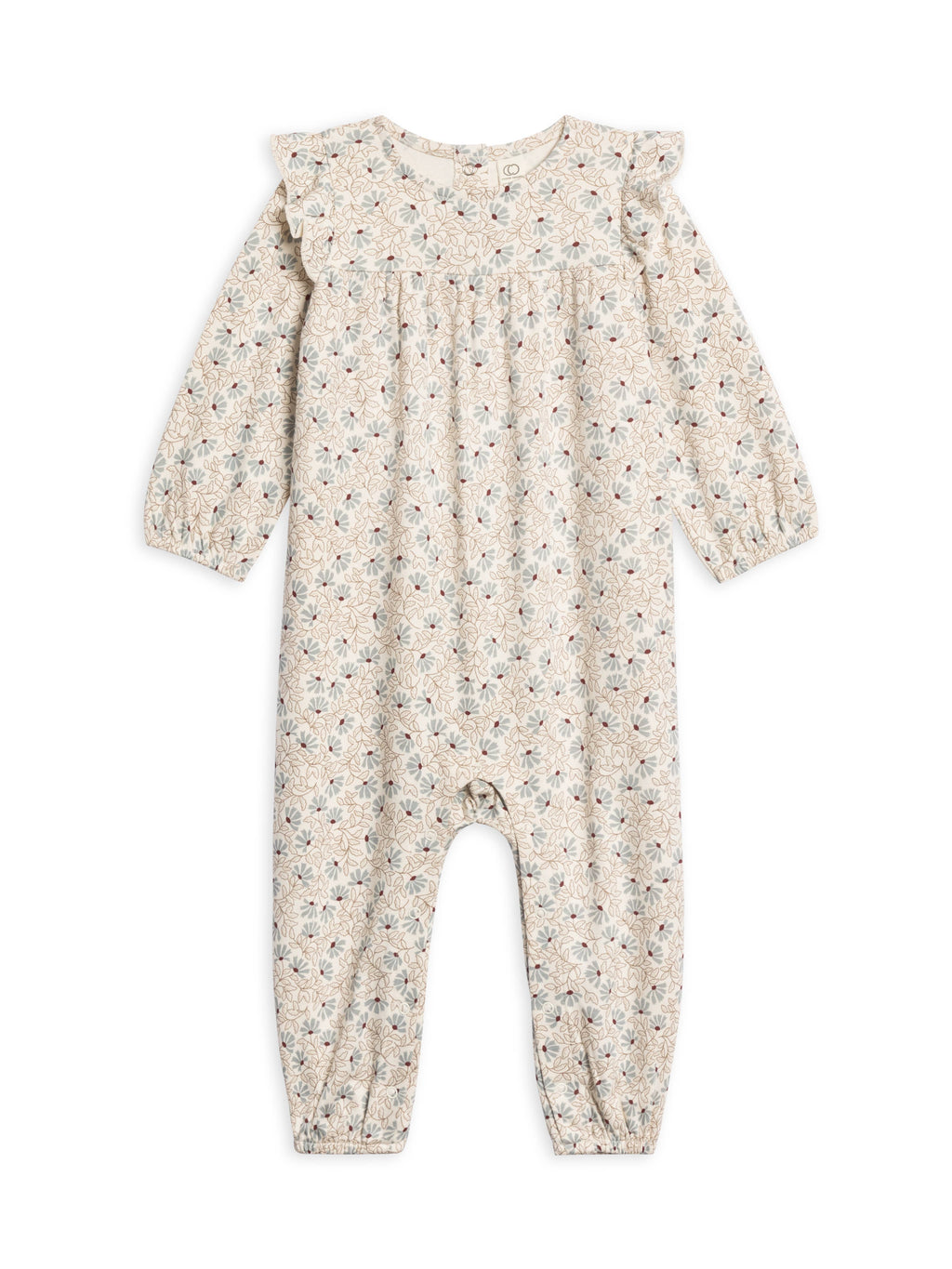 The Jine Ruffle Romper is soft, playful, and perfect for adventures. Featuring fluttery ruffle sleeves and gentle gathering throughout, this one-piece is designed for easy dressing and all-day movement. A snap back and leg opening make changes simple and quick.