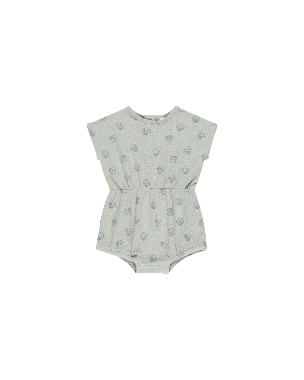 This spongy knit romper features a cinched waist, short sleeves, and hidden snaps for easy changes.
