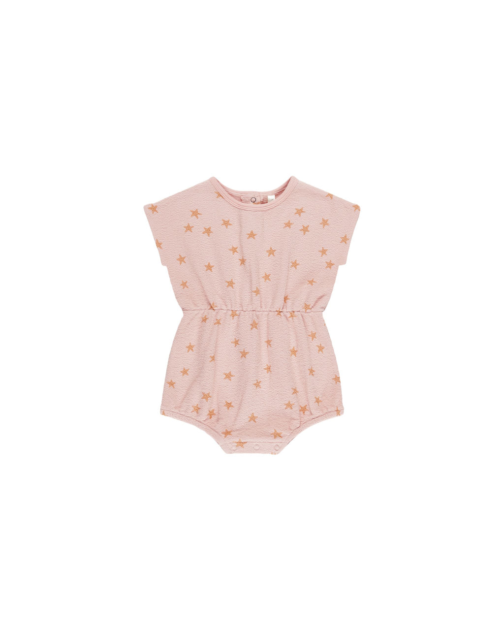 This spongy knit romper features a cinched waist, short sleeves, and hidden snaps for easy changes.