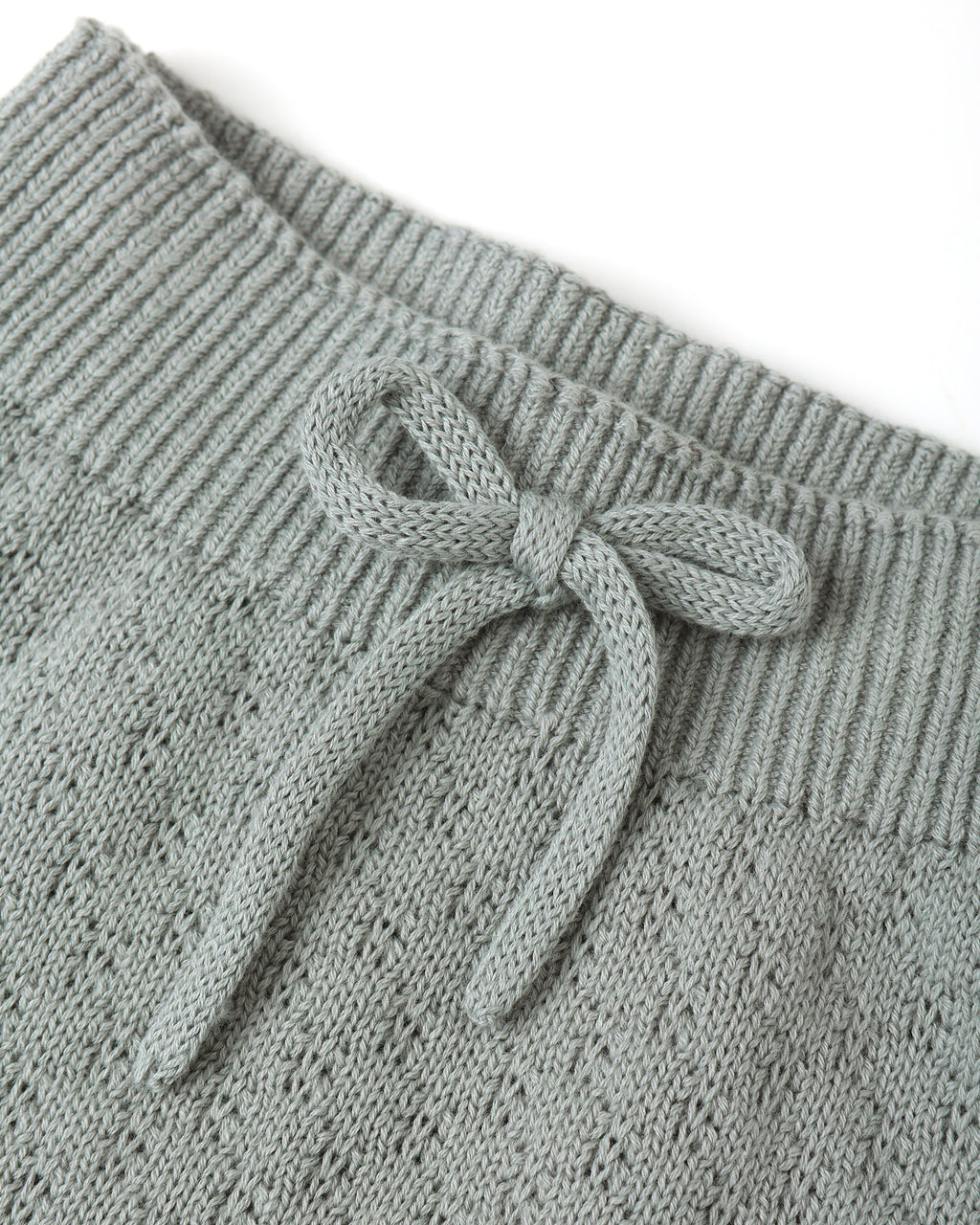 Knit wrap top with ribbed trim and coconut button closure, paired with knit footed pants featuring a fixed bow at the waist—the perfect set for your little ones.