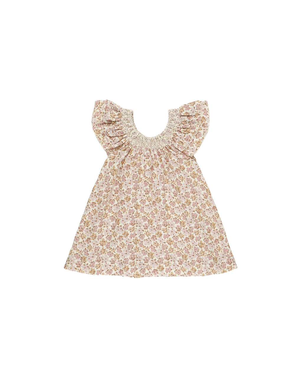 Our Lucia Dress features contrast elastic smocking at the neckline, and sweet flutter sleeves with merrowed trim.
