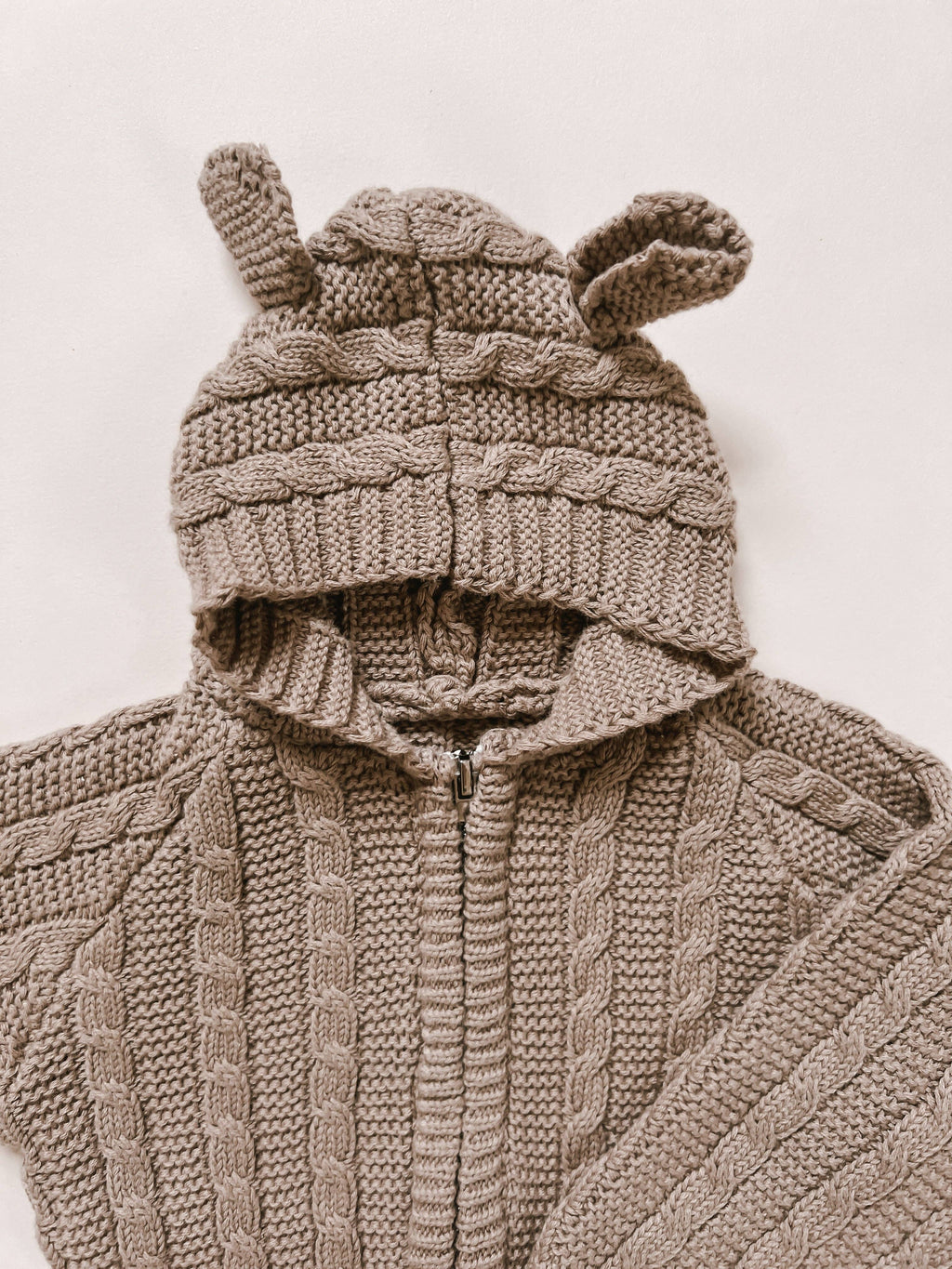 Our Baby Bear Cable Knit Jumpsuit is the perfect blend of comfort and cuteness for your little one! Our cozy jumpsuit is thoughtfully designed to keep your baby warm and snug during chilly days and nights. Crafted with love and attention to detail, this jumpsuit features a classic cable knit pattern that adds a touch of timeless charm. The premium quality, soft 100% Organic yarn ensures gentle contact with your baby's delicate skin, making it ideal for cuddles and playtime. The front zipper closure makes dressing and undressing a breeze, saving you precious time while keeping your baby comfortable.