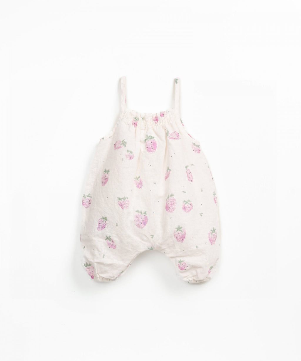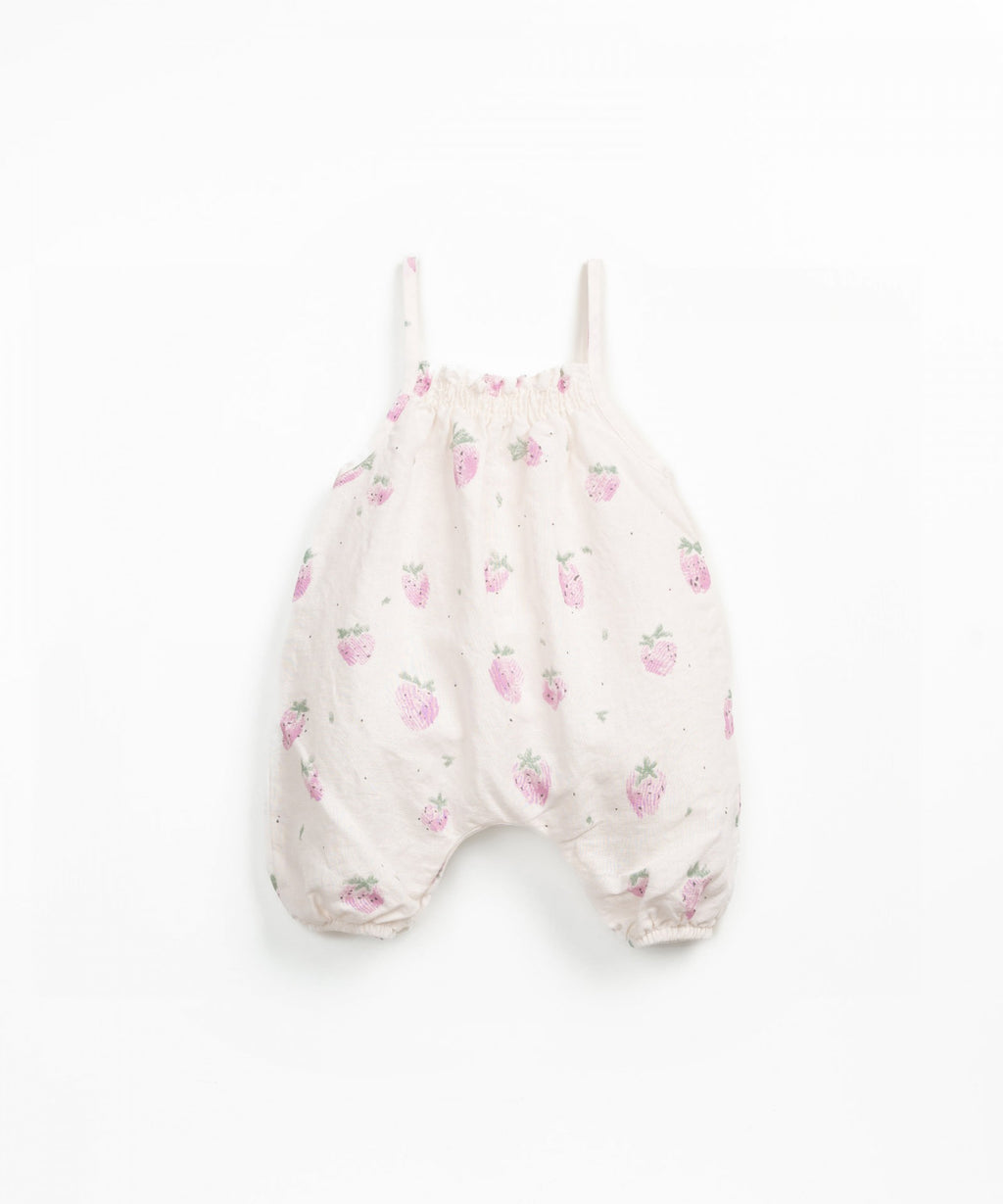 This jumpsuit is made of linen and organic cotton fabric in the Grés Strawberries color. It features thin straps, a waist cutout, elasticated legs, a strawberry pattern, and coconut buttons.