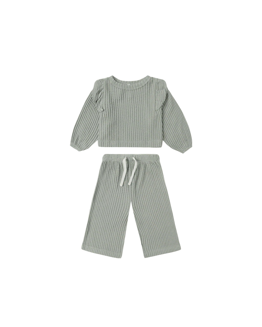 Made for cozy days, this darling set in our fuzzy waffle knit includes a long sleeve top with ruffle shoulder detail and wide leg pants featuring an elastic waistband and fixed cotton drawstring.