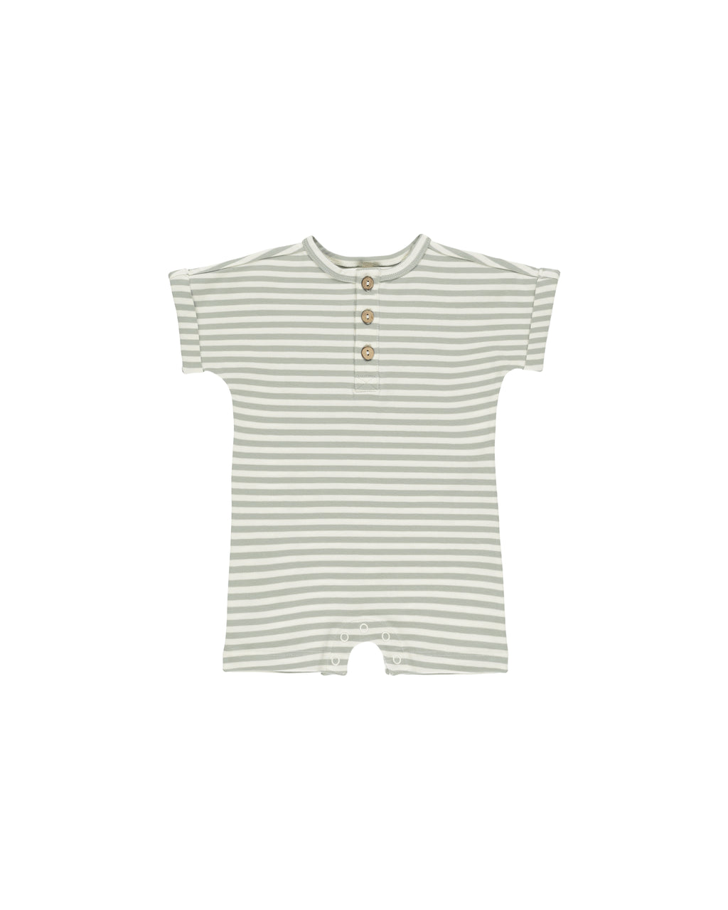 Our short-sleeve romper has folded cuffed sleeves, buttons down the chest, and snaps along inseam for easy changes - the perfect lightweight summer staple!