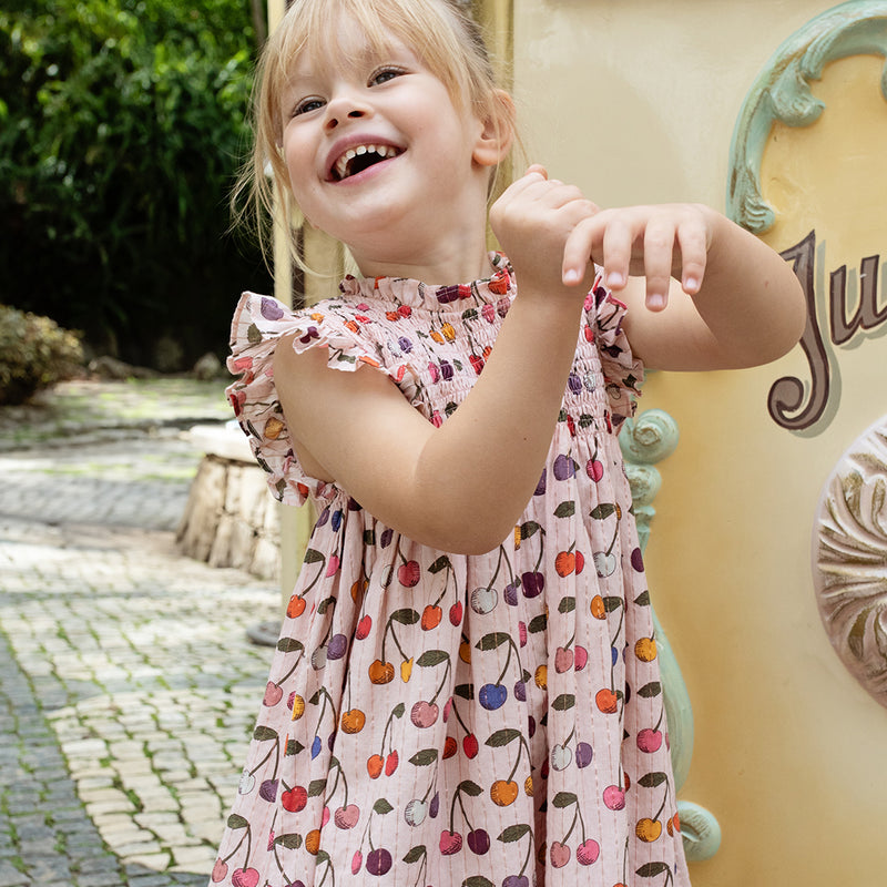 Cherries On Top! A colorful array of cheery cherry twins, on a pale pink ground, sweetens our flock favorite Girls Stevie Dress, in Cloud Pink Cherry. This much loved silhouette stands out with its fluttery ruffled arm and delicate ruffle at the neck and vintage inspired smocking at the chest. Invisible zipper closure at the back. Match back to Baby Sis in our Baby Girls Stevie Dress Set for a ripe-for-cuteness twinning moment.