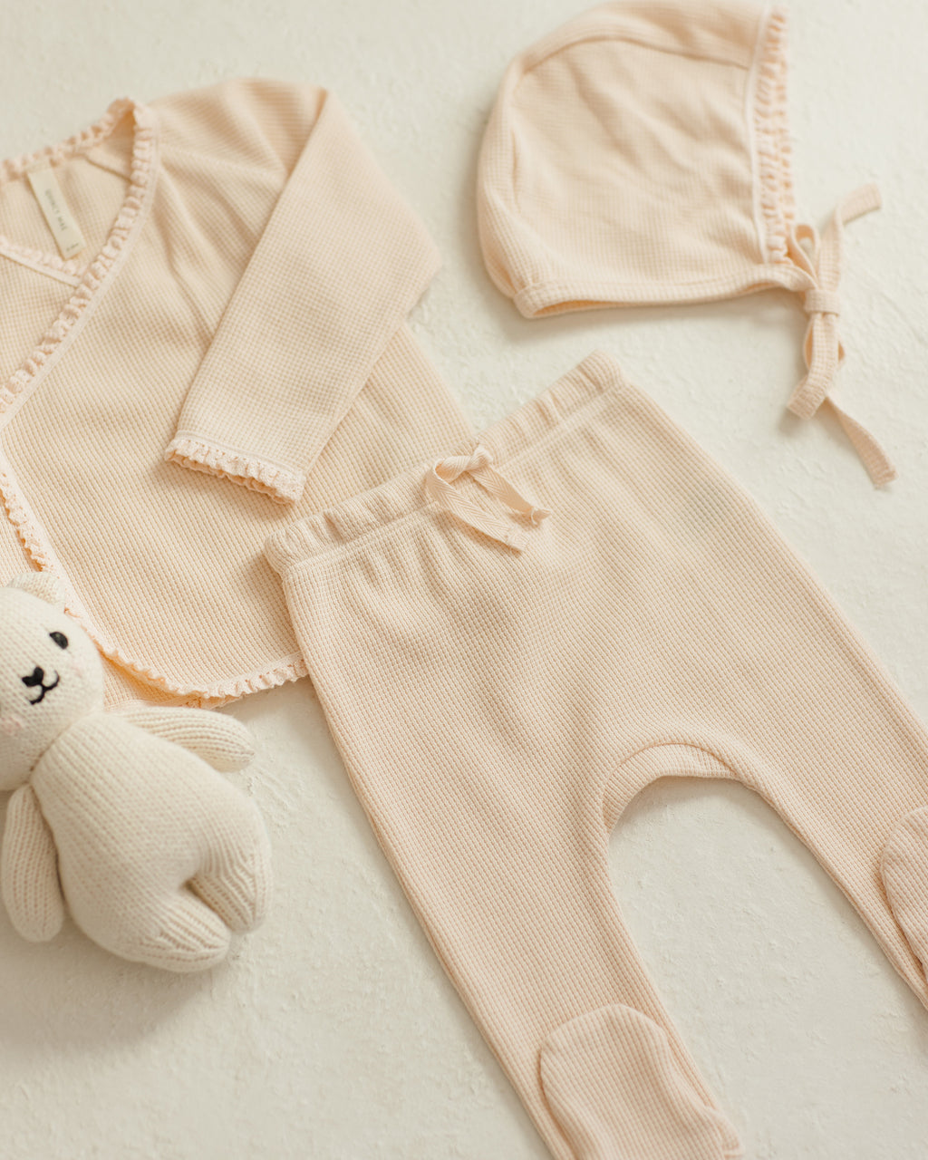 Our Take Home Set in our lightweight waffle material is the perfect look for your newborn. Featuring a sweet bonnet, wrap snap top with crochet lace ruffle detail, and footed drawstring pants.