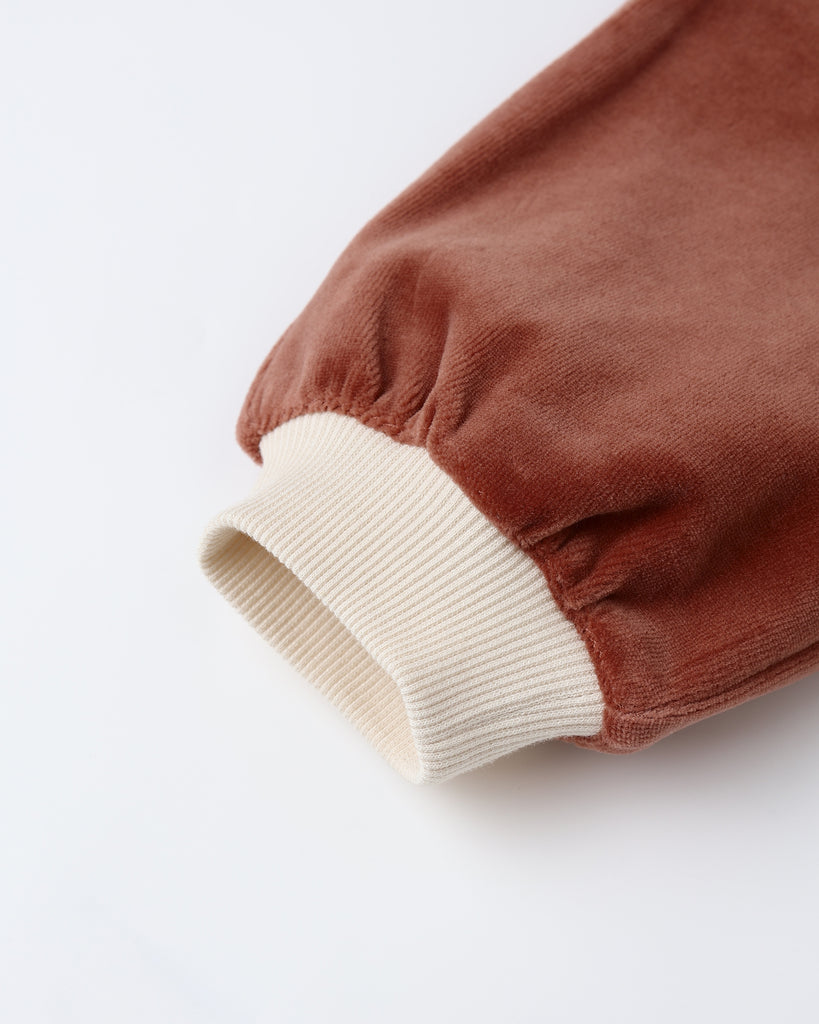 Longsleeve hooded fleece jumpsuit with ribbed sleeve and leg openings, a zipper down the front, and a hoodie with a pom pom on top. Featuring our 'cranberry' hue.