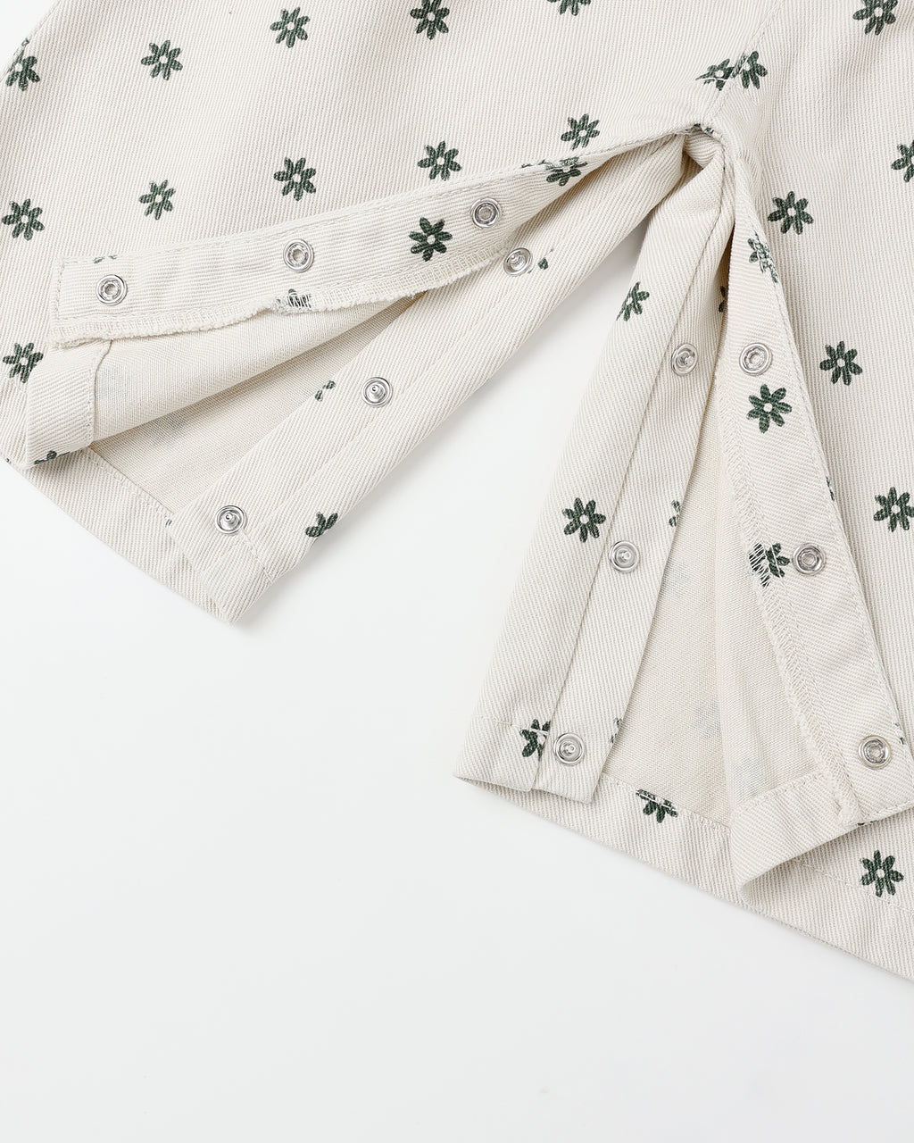 Bringing effortless style, these wide leg overalls feature classic prints, gathered patch pockets, and antique brass buttons and snaps.