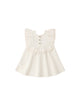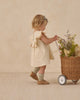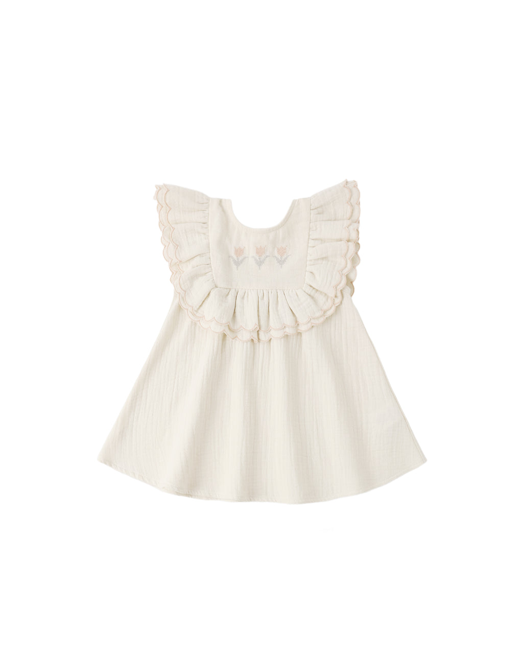 Our Lulu Dress is perfect for your springtime occasions. Featuring a gathered ruffle with merrowed edge detail along the chest with tulip embroidery and buttons on back for easy changes.