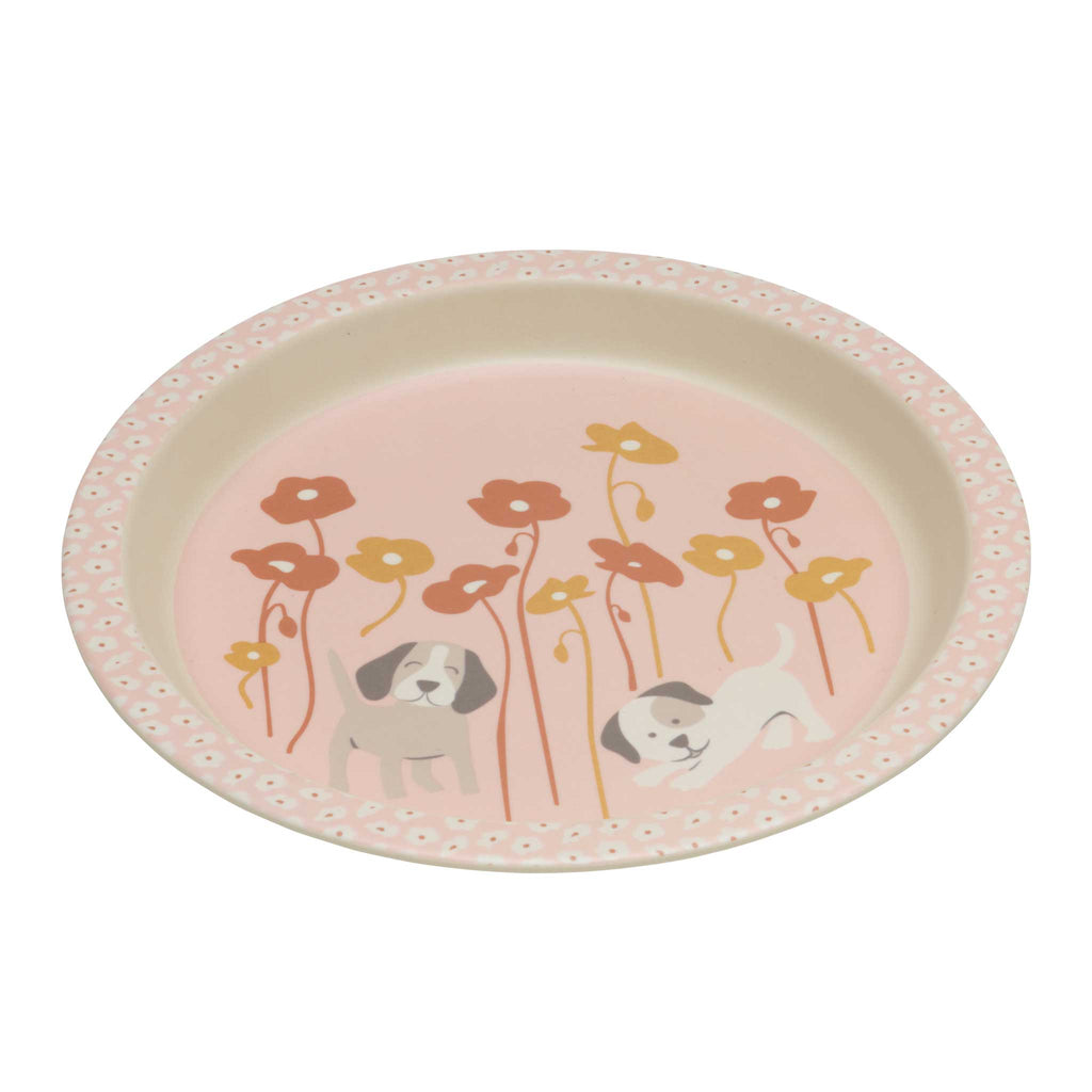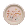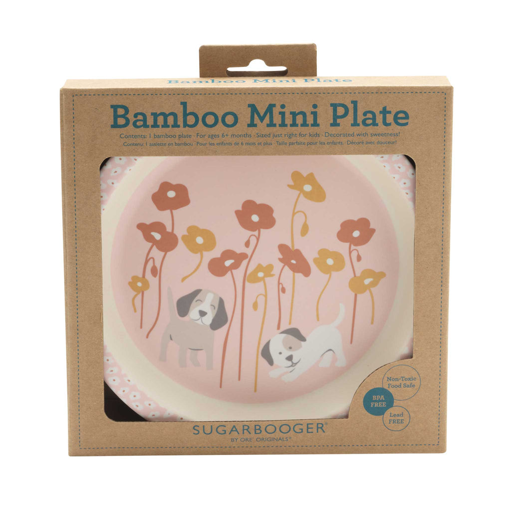 The Puppies & Poppies Bamboo Mini Plate features four footed furry friends & florals and has lovely frosted matte finish for a soft touch. The bamboo plate is stackable and has a low-profile to avoid spills. Great for gifting as it comes in a box. Size (inches): 7.00 dia x .75 h (holds 3/4 cup)