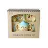 Description Baby melamine dinner set in a lovely gift box. This cute giftbox is an absolute must-have for new parents. It comes with 4 pieces of baby's first tableware - a 4-room plate, sippy cup with handles and a set of cutlery (spoon and fork).