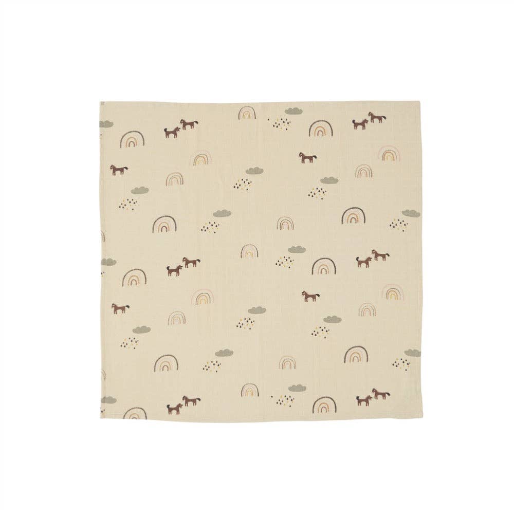 3-pack of muslin cloths for the little girl. 2 of the cloths are solid colored, while the third is made in a cute design with rainbows. Can be washed by 40° - 100% organic cotton - oekotex standards.
