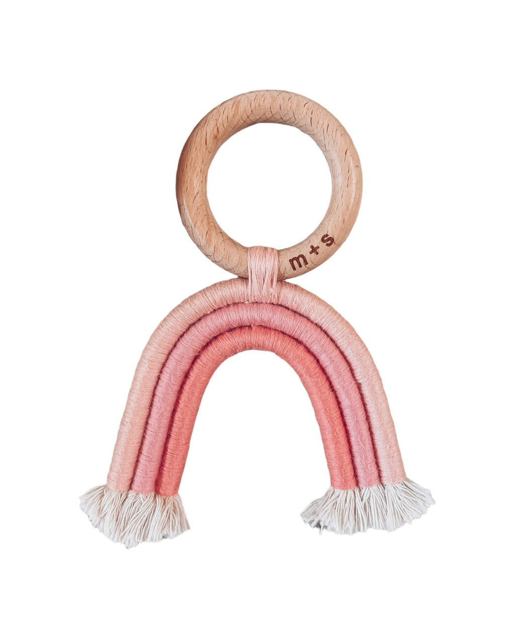 Teething just got a whole lot more colorful! This soft, organic cotton rainbow teether is perfect for little ones exploring the world with their mouths. The gentle pink hue and cheerful rainbow design make it a joy to hold and chew, while the natural fabric is kind to sensitive gums. Lightweight and easy for tiny hands to grasp, it's a safe, chemical-free way to soothe teething discomfort. Watch your baby light up as they discover their new favorite chew toy!