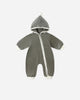 Long sleeve hooded fleece jumpsuit with ribbed sleeve and leg openings, a zipper down the front, and a hoodie with a pom pom on top.
