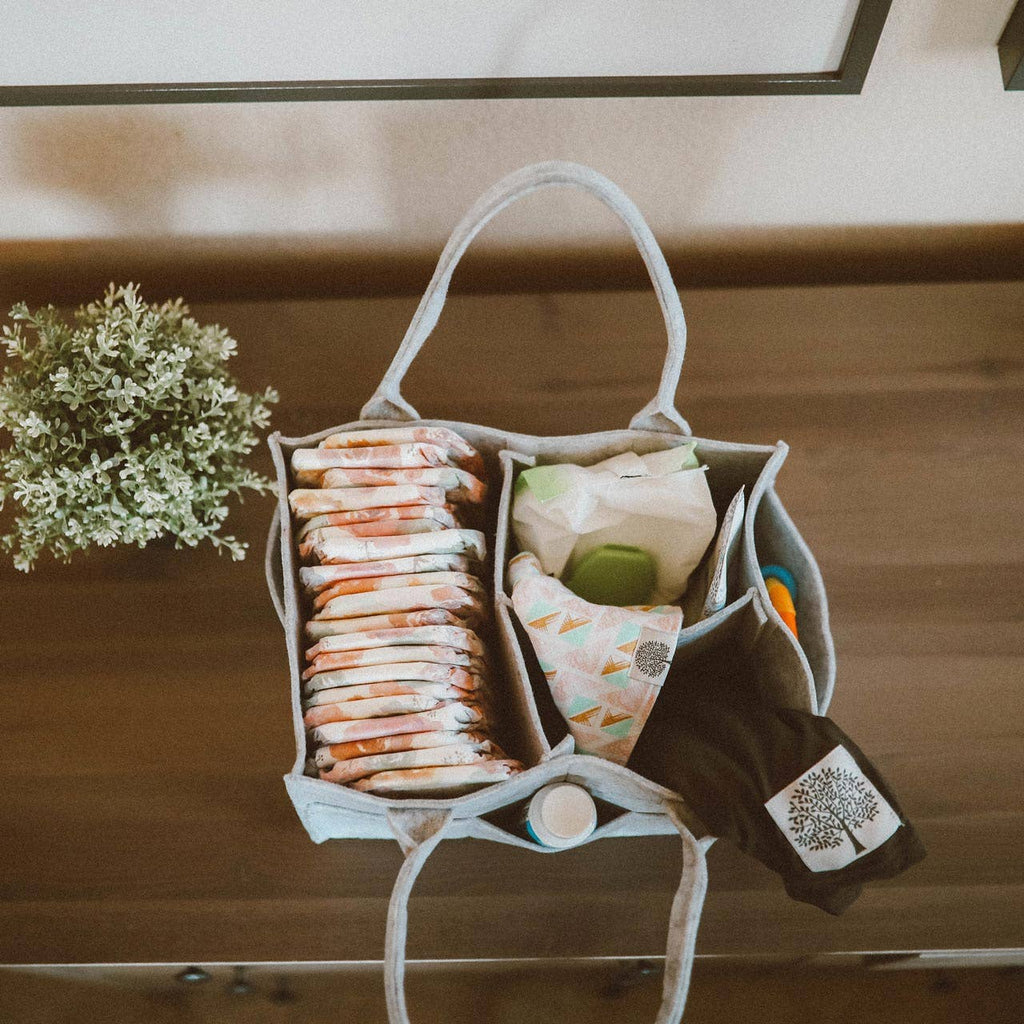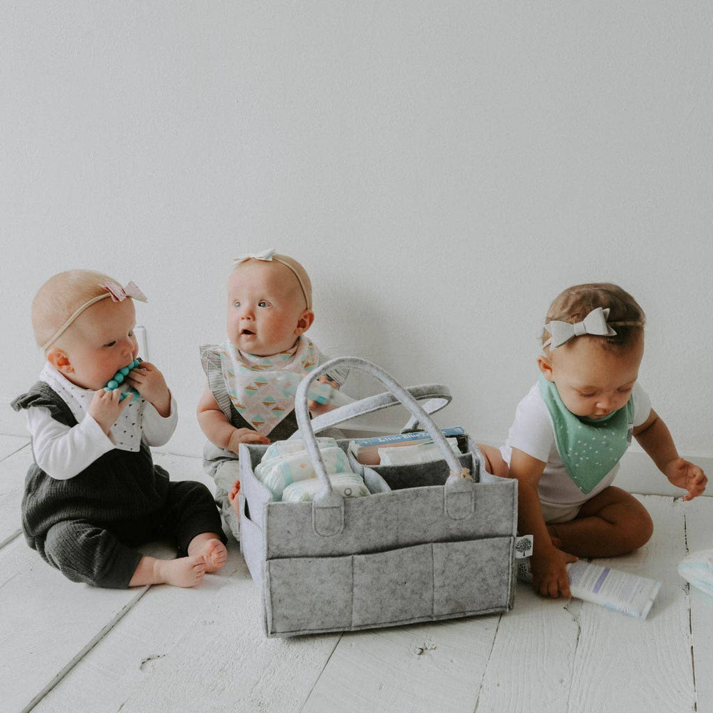 Our Felt Diaper Caddy is perfect for diaper organization and ideal for changing table supplies, baby books, or toys. Made with durable felt that won't show wear, it keeps you flexible and organized. Features: - Removable insert for versatility - 8 exterior pockets for necessities - Neutral design to complement any nursery The Felt Diaper Caddy simplifies routines and keeps parents flexible. It stores diapers, wipes, cream, and accessories for a perfectly organized changing station. Perfect for nursing mothers, it carries pumping supplies efficiently. Use it in the car to store snacks, outfits, and changing supplies. The Diaper Caddy is also great as a gift basket for baby showers, available in 4 neutral colors to blend into any environment. Offer your customers baby products that make life easier. Our Felt Diaper Caddy simplifies routines, keeps parents organized, and adds style to any space. Regular Size: 13 x 9 x 7"