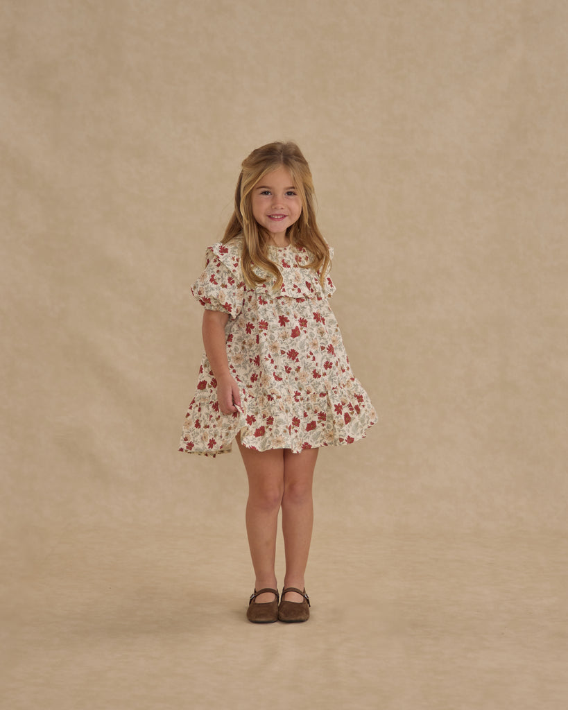 Our Cordelia Dress features elasticized sleeve openings and a ruffle along the neck and bottom skirt.