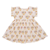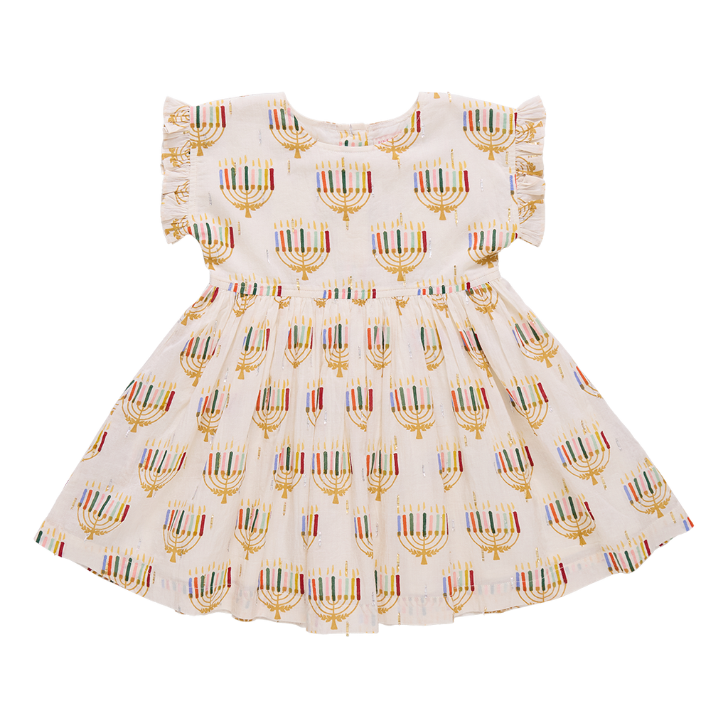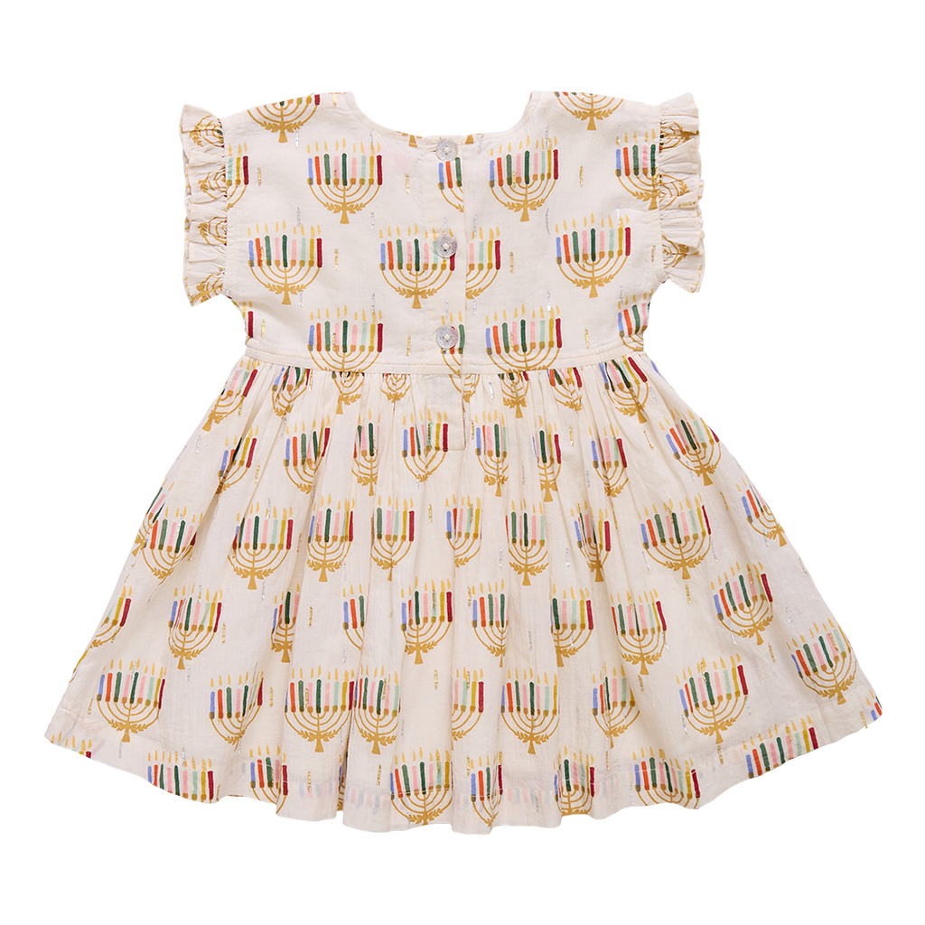 Holiday Glow Up! Our Girls Adaline Dress, in our Colorful Menorahs print, celebrates each of Hanukkah's eight festive nights with a different hued candle! Flickering candles nestled in antique menorahs shine from a creamy ground in this latke-party ready piece. A newly ruffled sleeve compliments this scoop neck, flock favorite silohuette. Silver glitter buttons at the back echo the print's sparkling candles. Top with our Blue Menorah Girls Maude Sweater for a festive holiday look.