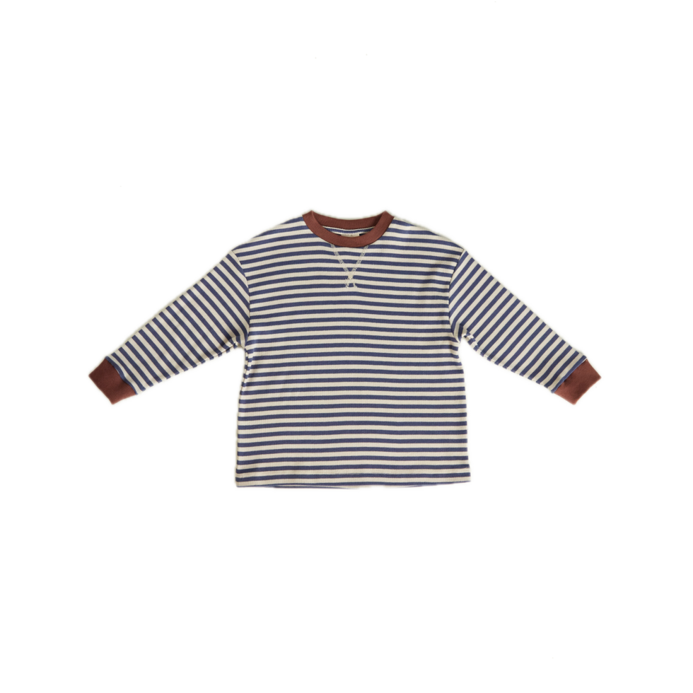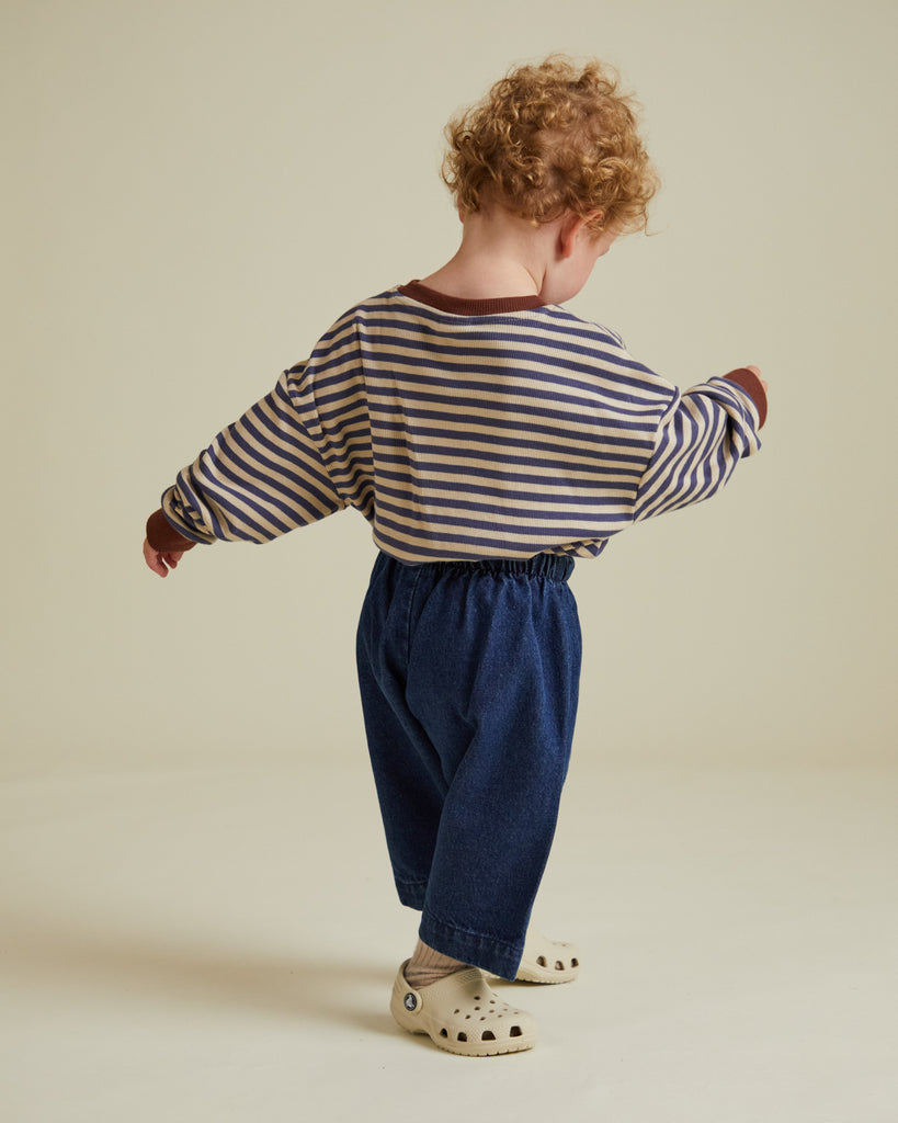 A striped essential with subtle Claude details – the Jamie Inky Stripe Tee is designed in cream and inky blue with contrast-washed rust ribbing at the neckline, cuffs, and hem. Designed in our signature oversized fit with dropped shoulders and crafted from 98% GOTS-certified organic ribbed cotton with a touch of stretch. Finished with our exposed side-seam label, it’s a considered staple made to last.