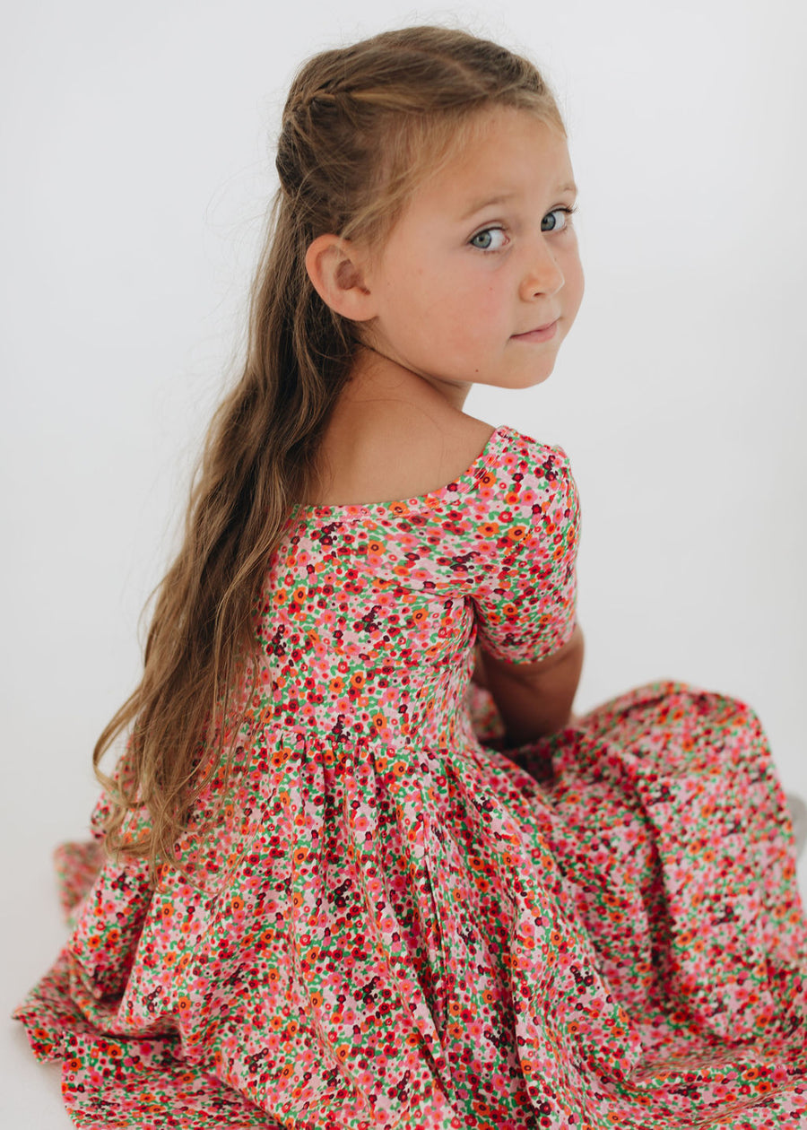 Our signature Good Apples dress is made from stretchy-soft organic cotton and designed with a ballet-inspired silhouette. It features a fitted bodice and sleeves, a graceful scooped back, pockets for all their treasures, and a full circle skirt for endless twirling.