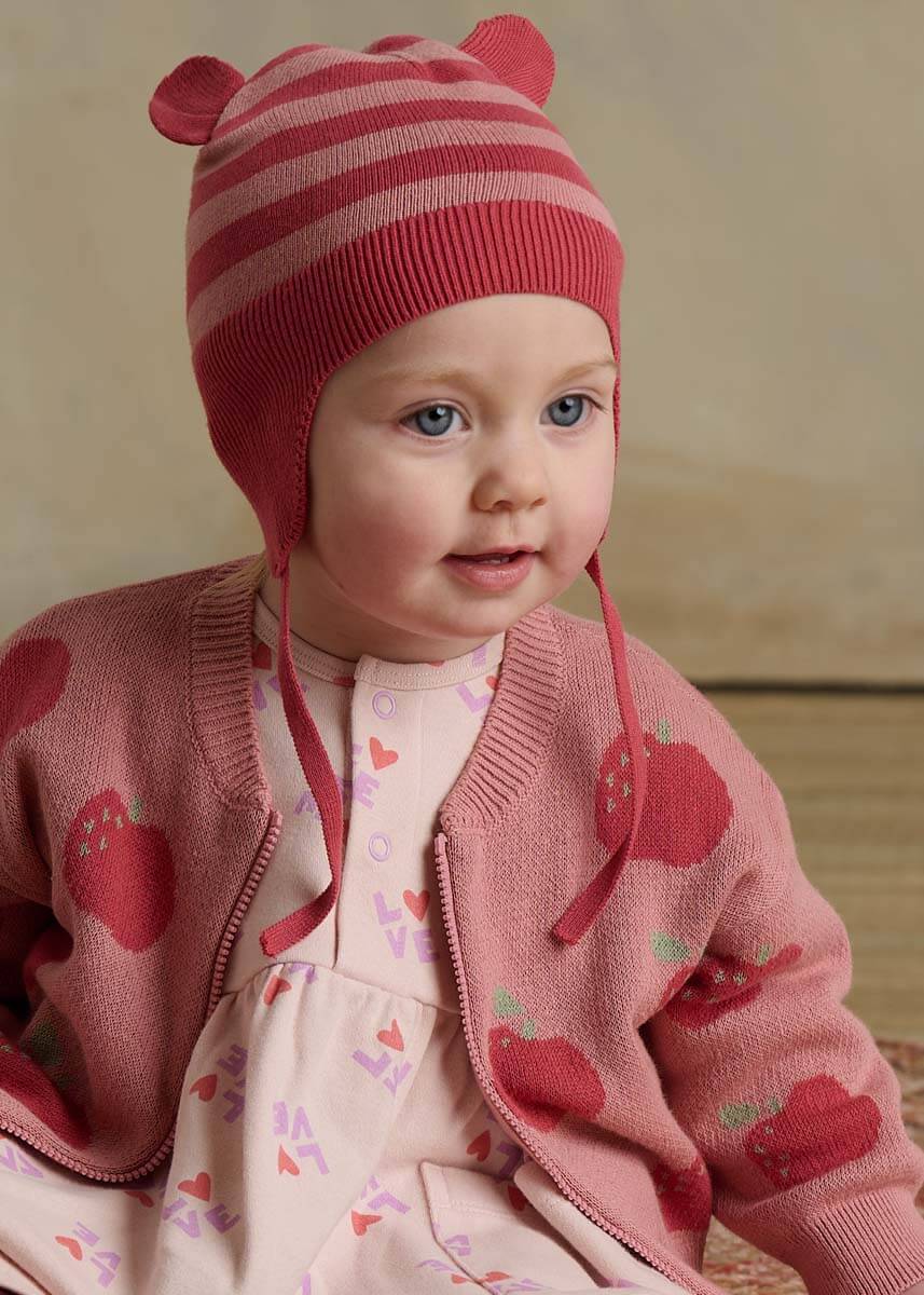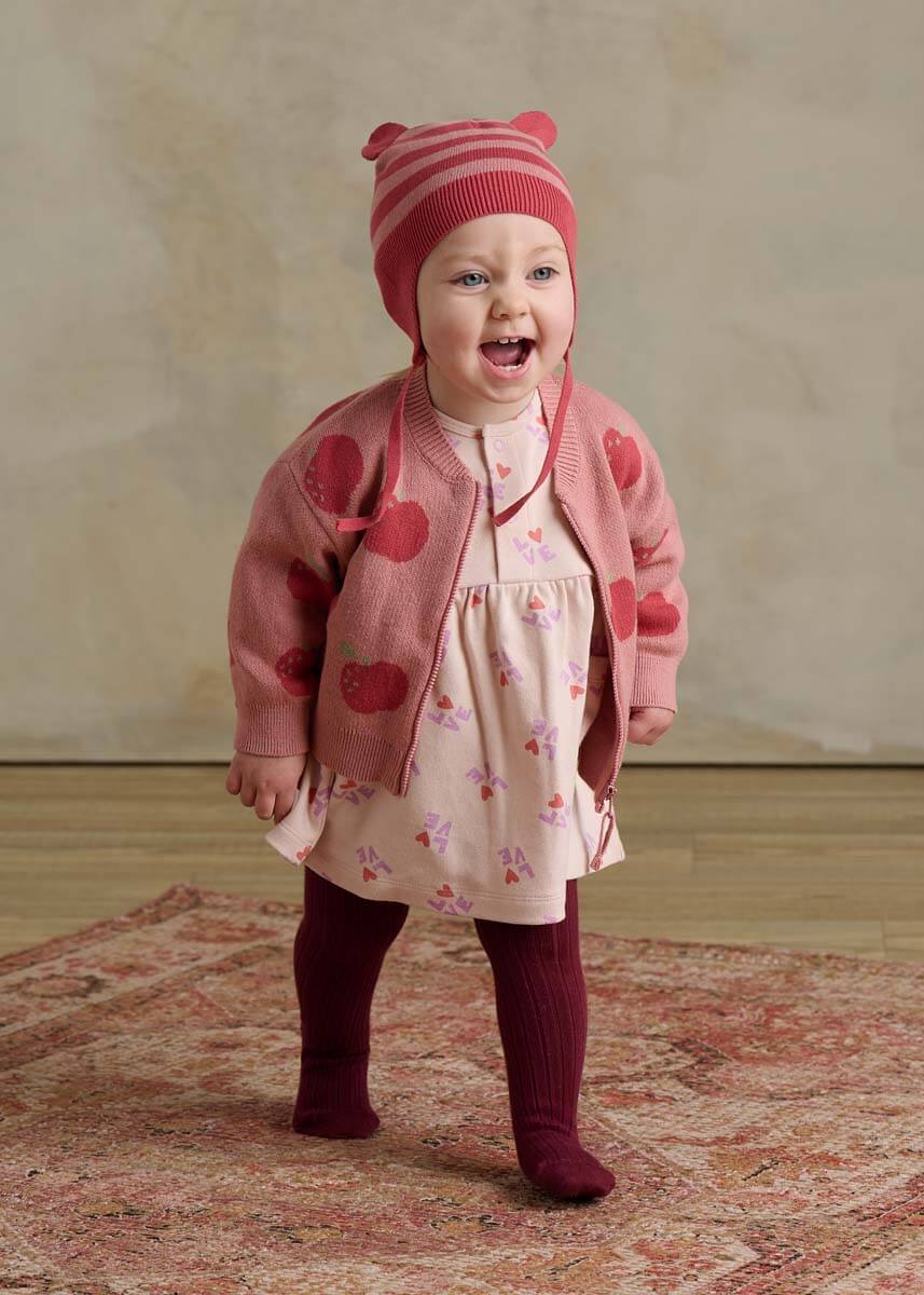 Wrap your little one in cozy charm with the Aymer Apple Knit Cardigan in Rosy. Soft, breathable knit fabric keeps them comfy while playful apple details add a sweet touch to any outfit. Perfect for layering during chilly days, this cardigan combines warmth and whimsy for everyday adventures.