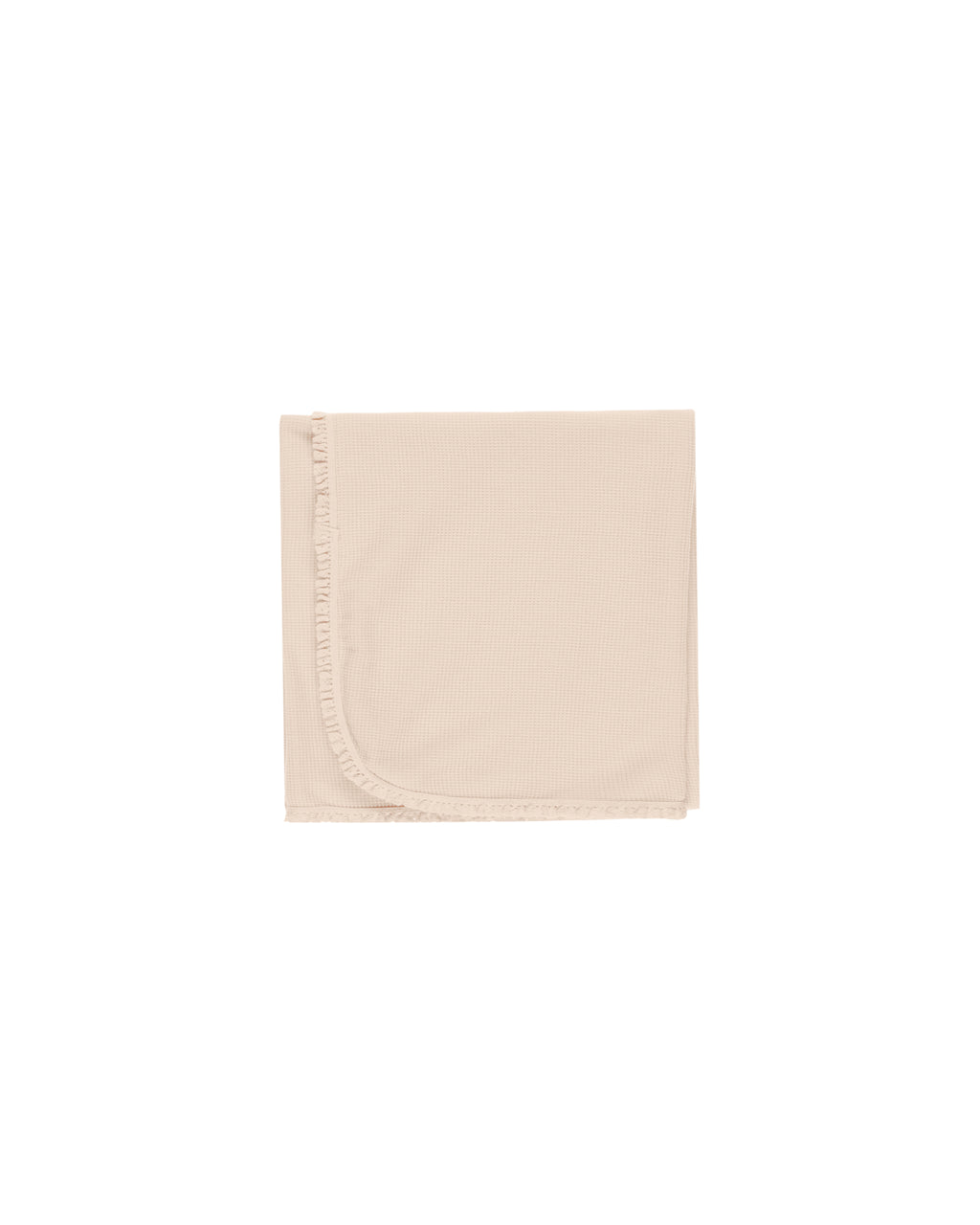 Our waffle baby blanket is the perfect size for the stroller, car seat, or just at home! Designed with crochet lace ruffle detail for the sweetest look.