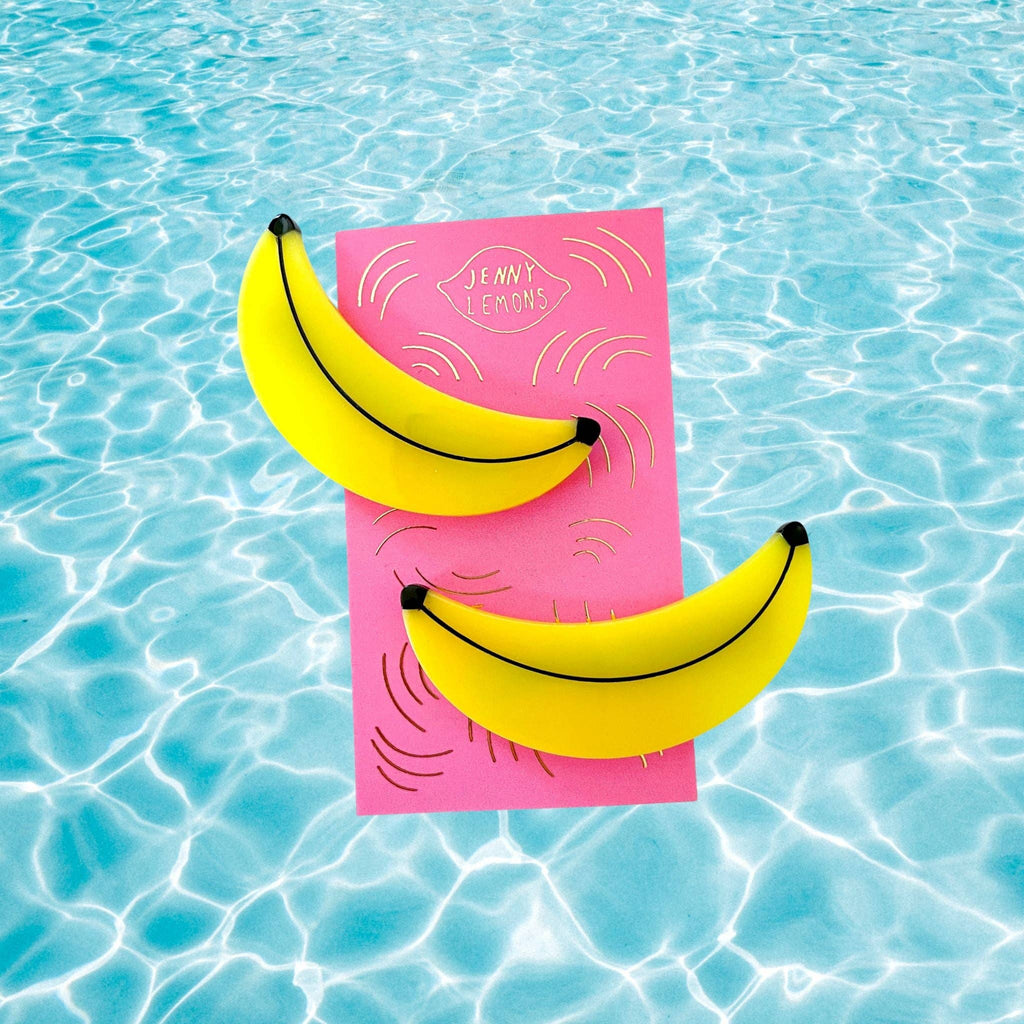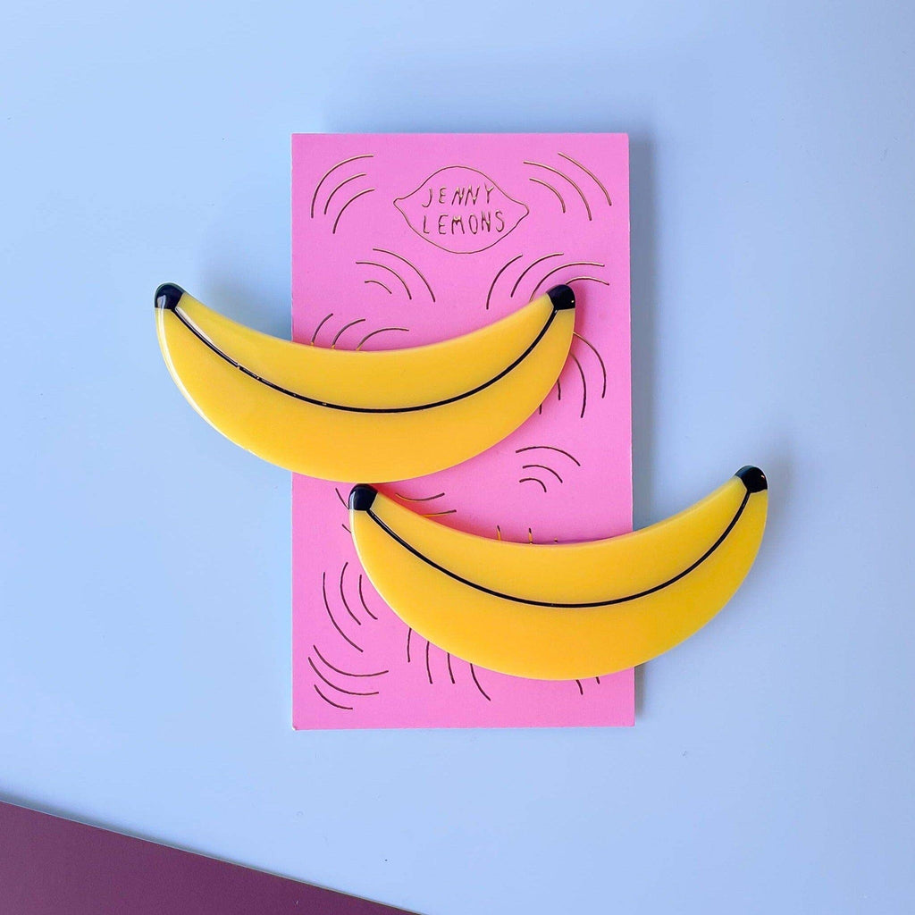 Bananas aren't just for monkeys anymore! Tame your hair with this set of two banana-shaped alligator clips. You'll absolutely love them! Each handmade and hand-painted clip measures 2.5" x 1.5", featuring unique color variations. Embrace playful style with these adorable banana hair clips.